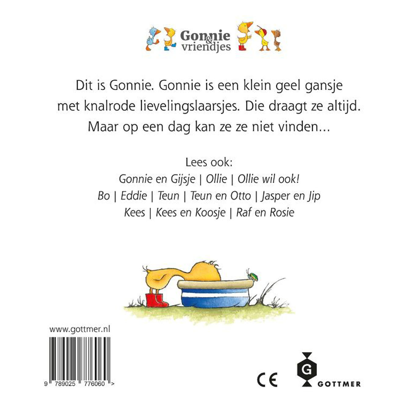 ‘Gonnie’ is het eerste deeltje in de mateloos populaire serie over het kleine gansje Gonnie en al haar vriendjes. Elk boekje in de serie voor peuters is een verhaaltje dat heel dicht bij de beleving van peuters staat. Maar ook voor ouders valt er veel te lachen met deze boekjes. In dit eerste deeltje is Gonnie haar rode laarsjes kwijt. Na lang zoeken vindt ze ze uiteindelijk terug aan de flippers van een ander gansje, Gijsje. Gijsje mag één laarsje houden en Gonnie en Gijsje worden dikke vrienden.