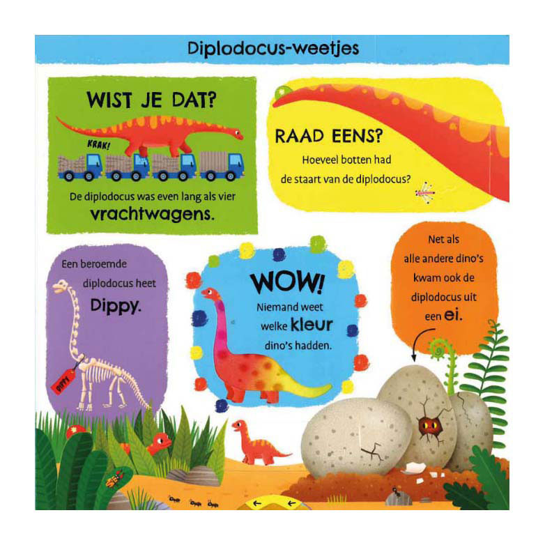 De combinatie van de vrolijke tekst op rijm, de kleurrijke tekeningen en de flapjes maakt dit boek onmisbaar voor de allerjongste dinofans!