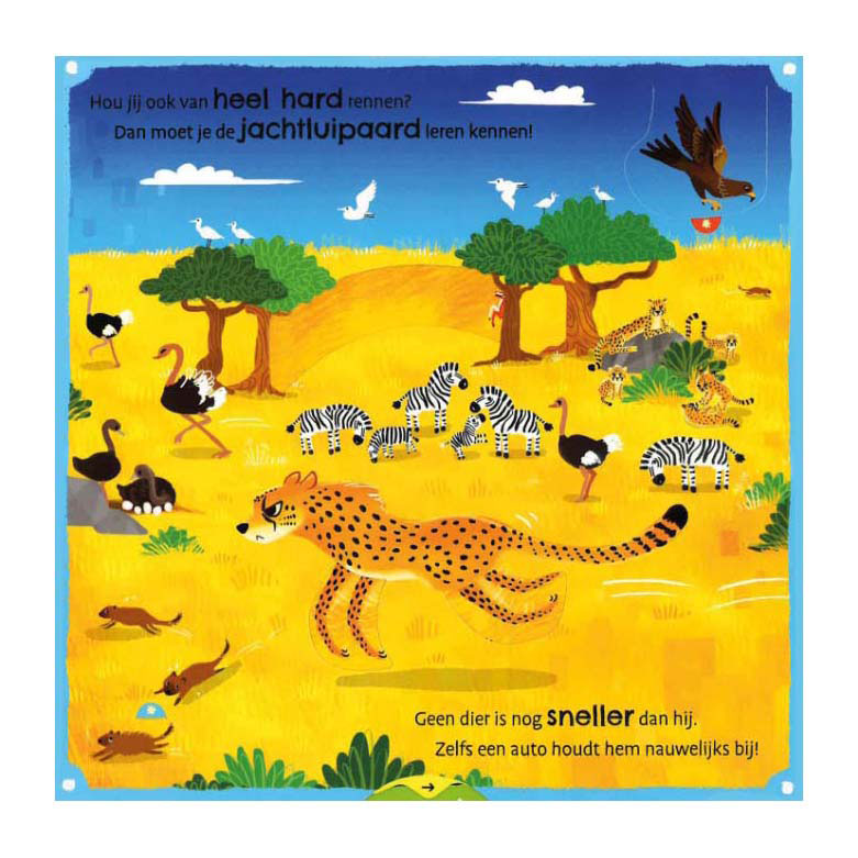 Bij de dieren staat boordevol leuke weetjes en verrassende informatie over de wonderlijke wereld van de dieren. Ontdek hoe lang een blauwe vinvis is, hoe hard een jachtluipaard kan rennen, hoeveel mieren een miereneter per dag eet en nog veel meer!