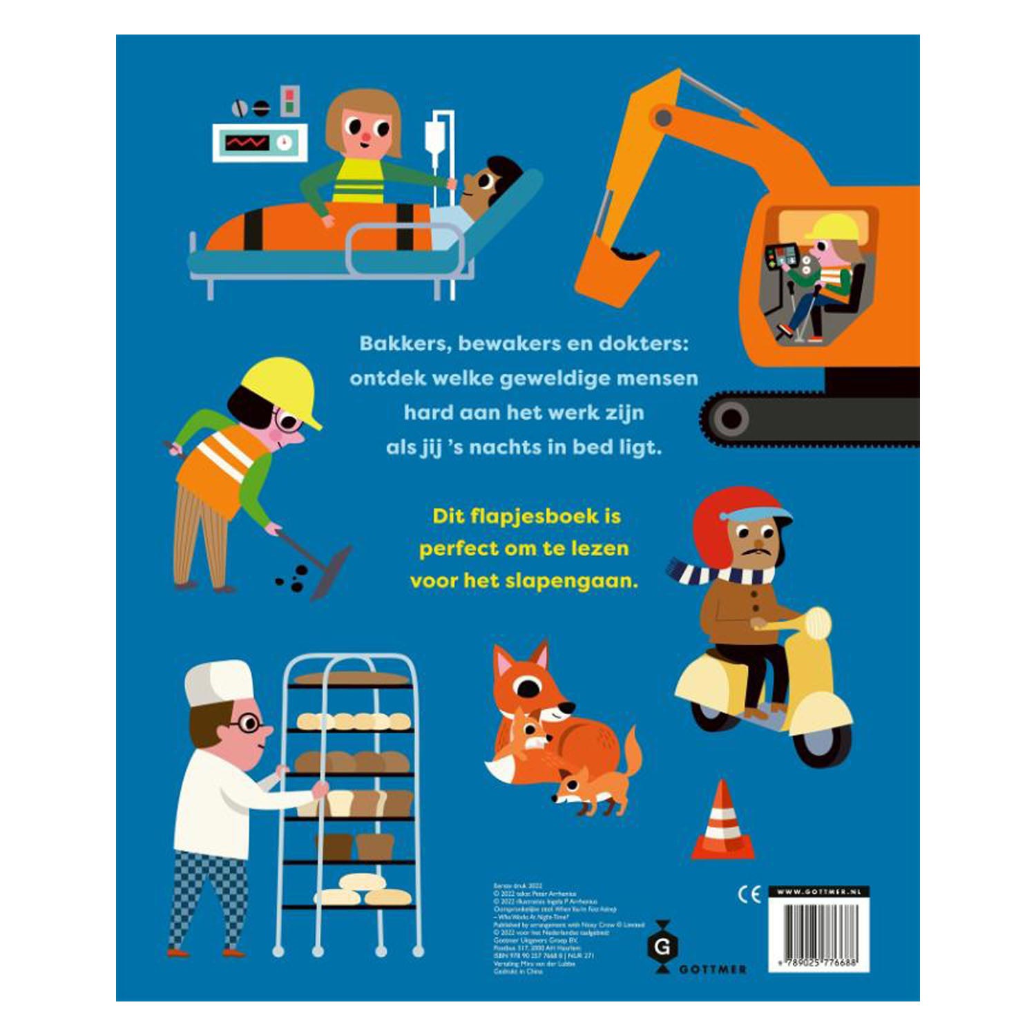 Het lijkt soms misschien alsof iedereen 's nachts lekker in zijn warme bedje ligt, maar dat is niet het geval! In dit kleurrijke boek staan een paar beroepen die diep in de nacht uitgevoerd worden, zodat het leven elke ochtend weer in alle drukte kan beginnen. Denk aan beroepen als visser en machinist, en ook de dokter en verpleger zijn al heel vroeg aan het werk. Zoals zo vaak opent Ingela P Arrhenius de ogen van de allerkleinsten voor nieuwe, spannende concepten met meer informatie over de wereld om hen heen.