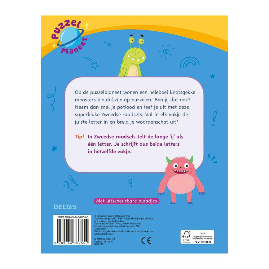 Op de puzzelplaneet wonen een heleboel knotsgekke monsters die dol zijn op puzzelen! Ben jij dat ook? Neem dan snel je potlood en leef je uit met deze superleuke Zweedse raadsels. Vul in elk vakje de juiste letter in en breid je woordenschat uit!