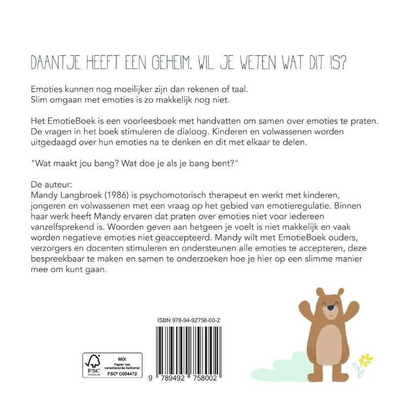 Het EmotieBoek is een voorleesboek met handvatten om samen over emoties te praten. De vragen in het boek stimuleren de dialoog. Kinderen en volwassenen worden uitgedaagd over hun emoties na te denken en dit met elkaar te delen.