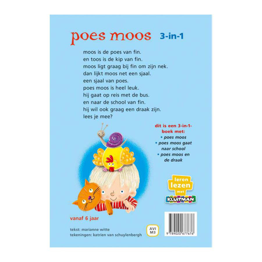 Poes Moos is dol op zijn baasje Fin. Het liefst is hij altijd bij hem. Dus als Fin naar oma Jet gaat, gaan poes Moos en kip Toos er gewoon achteraan. En als Fin geen zin heeft om naar school te gaan, dan gaat Moos toch naar school? En als Fin jarig is, wil Moos hem het allerleukste cadeau geven. Zelfs als hij daarvoor een draak moet zoeken. De drie boeken poes moos, poes moos gaat naar school en poes moos en de draak nu in een mooie bundel.