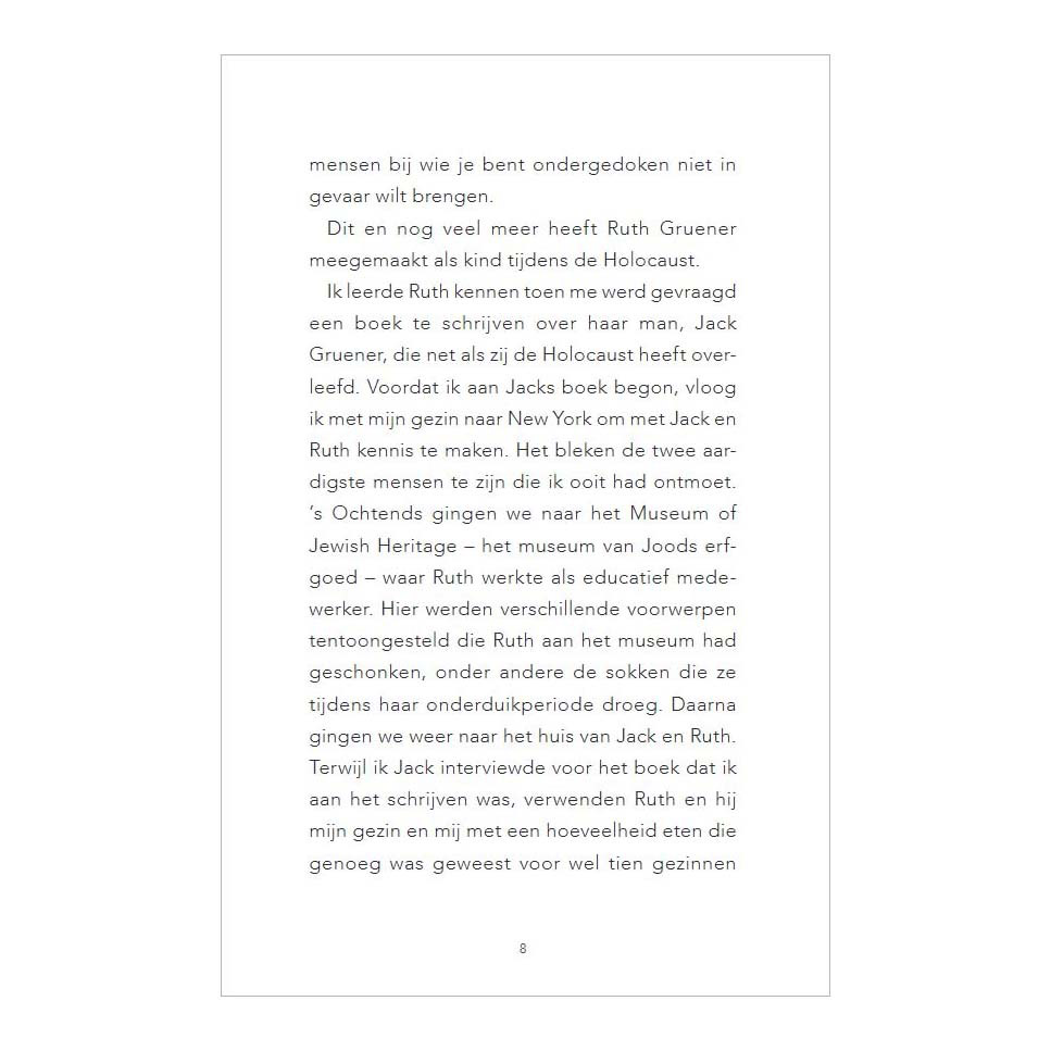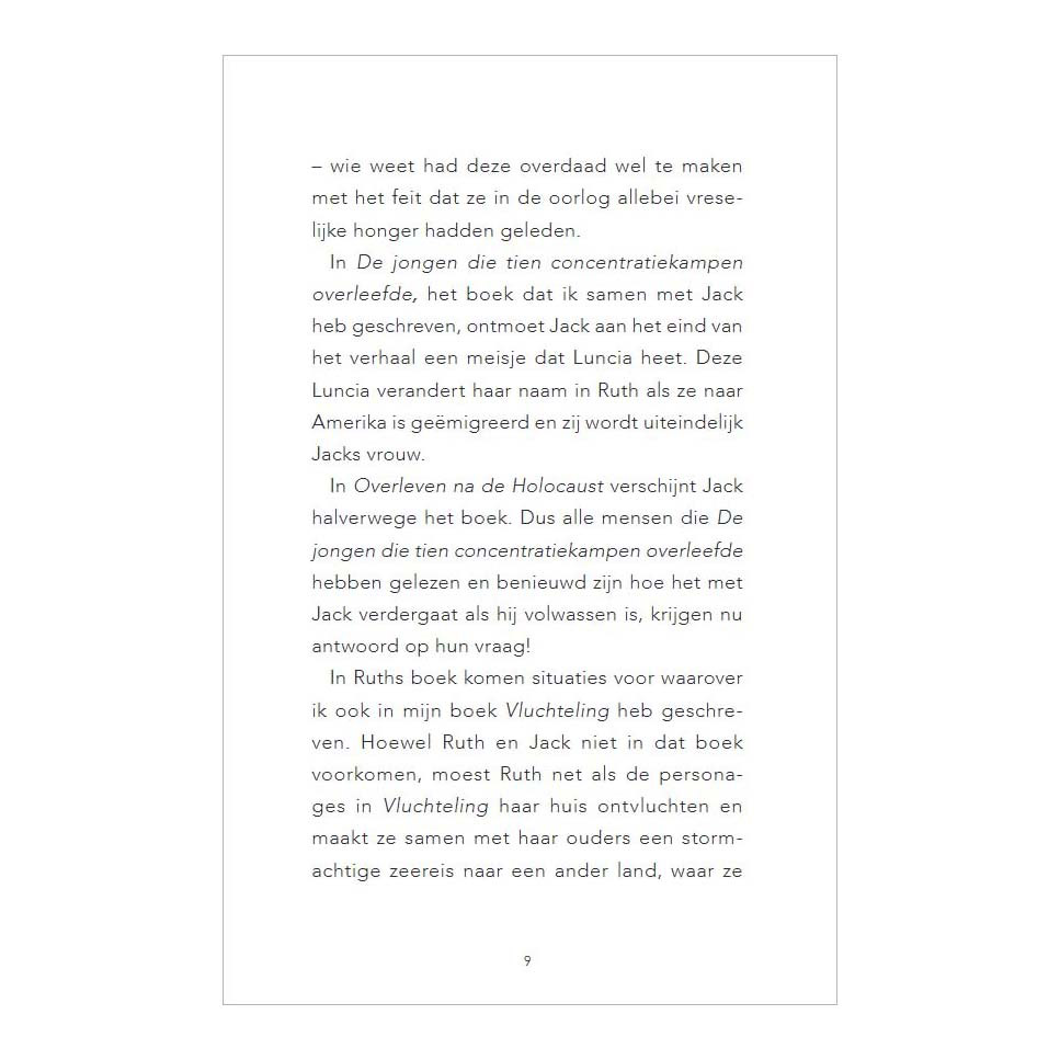 Ruth Gruener is pas vijf jaar oud als Duitsland Polen binnenvalt. Als Joods gezin zijn zij en haar ouders constant in gevaar en ze moeten dan ook jarenlang onderduiken. Ruth en haar ouders weten de oorlog te overleven en zijn dolgelukkig om weer vrij te zijn, maar worstelen met het herpakken van hun levens. Nu ze in Polen niets meer te zoeken hebben, vertrekken ze naar Amerika, voor een nieuwe start. Daar blijft Ruth vechten tegen de nachtmerries en flashbacks van haar leven tijdens de Tweede Wereldoorlog. Overleven na de Holocaust is niet alleen het aangrijpende verhaal van een Joods meisje in de Tweede Wereldoorlog, maar laat ook zien met wat voor moeilijkheden iemand te maken krijgt in de lange nasleep van een groot trauma. Ruth Gruener is de vrouw van Jack Gruener, de hoofdpersoon uit het boek De jongen die tien concentratiekampen overleefde.