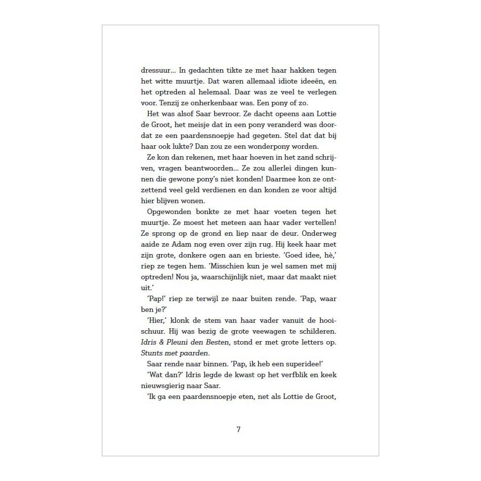 Het rustige leventje van Saar en haar vier paarden komt op zijn kop te staan als haar vader moet stoppen met werken. Hij deed als stuntman mee aan spectaculaire paardenshows, maar kan door een ongeluk niet meer optreden. Saar laat het er niet bij zitten en komt in actie. Ze heeft gelezen over Lottie, een meisje dat na het eten van een paardensnoepje in een pony is veranderd. Als Saar nou zelf eens in een pony verandert, dan kan ze optreden en geld verdienen! Het lukt en Saar trekt volle zalen als Lexi de wonderpony. Ze is zelfs zo populair dat sommige mensen haar per se willen hebben, ook al is ze niet te koop.