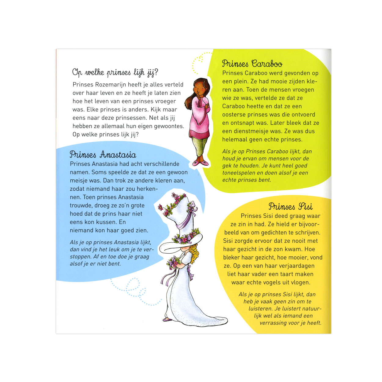 Wil je alles weten over prinsessen? In dit boek lees je meer over de jurken die een prinses aantrekt, het kasteel waarin ze woont, de dingen die ze wel en niet mag doen. Hoe ziet haar dag eruit? Wat leert ze allemaal? Loopt ze nooit verloren in het kasteel? Op deze en vele andere vragen krijg je een antwoord. Je vindt in dit boek ook leuke versjes en opdrachten, een grote uitklappagina en een miniquiz, zodat je een echte expert wordt.