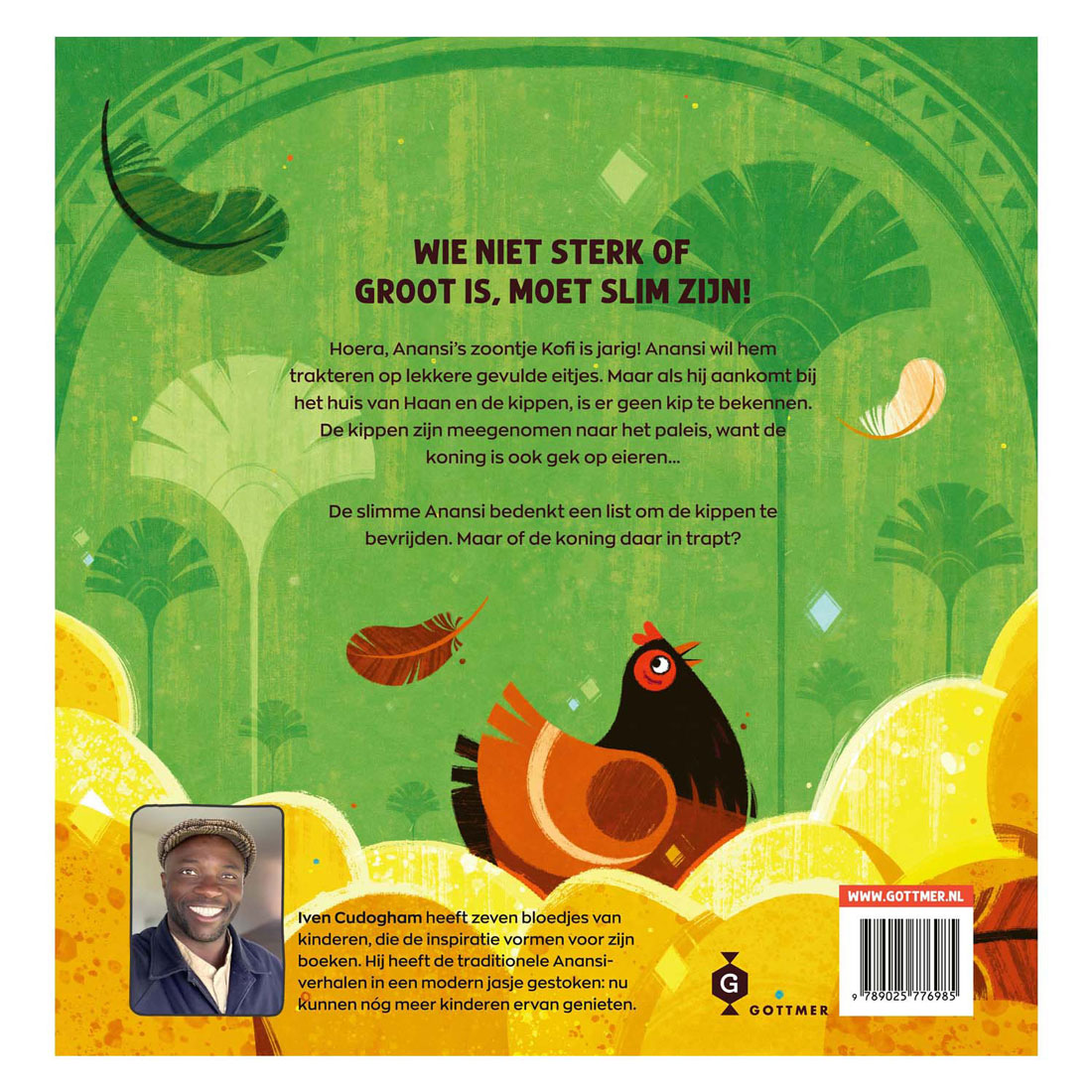 Voor de verjaardag van zijn zoontje Kofi wil Anansi hem trakteren op de lekkerste gevulde eieren. Maar als hij 's ochtends vroeg aankomt bij het huis van Haan en de kippen, treft hij alleen maar een huilende Haan aan - de kippen zijn weg! De koning en zijn wachters hebben ze allemaal meegenomen, want de koning vindt de eieren zo lekker dat hij ze allemaal voor zichzelf wil houden. Maar niemand bedenkt een list zoals Anansi dat kan, en dit laat onze achtpotige slimmerik natuurlijk niet zomaar gebeuren!