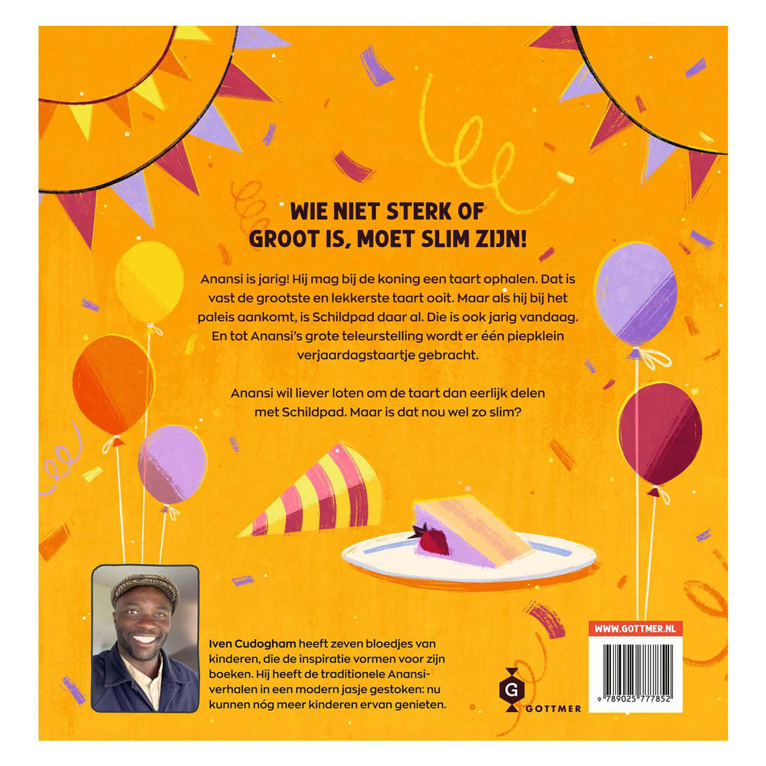 In 'Anansi de spin en de verjaardagstaart' ga je op avontuur met Anansi, de slimme spin uit tal van West-Afrikaanse, Surinaamse en Caribische volksverhalen. Anansi is ontzettend vrolijk, hij is jarig! Hij kijkt reikhalzend uit naar de taart die hij, zoals elk jaar, mag ophalen bij de koning. Deze taart belooft de grootste en lekkerste ooit te zijn, speciaal voor hem gebakken. Maar tot zijn verbazing ontdekt Anansi, wanneer hij aankomt bij het paleis, dat Schildpad daar al is. Hij is ook jarig vandaag. Wanneer het eindelijk tijd is voor taart, wordt er slechts een minuscuul gebakje binnengebracht. Anansi wil liever om de hele taart loten dan deze eerlijk delen met Schildpad. Maar is dat wel zo slim?