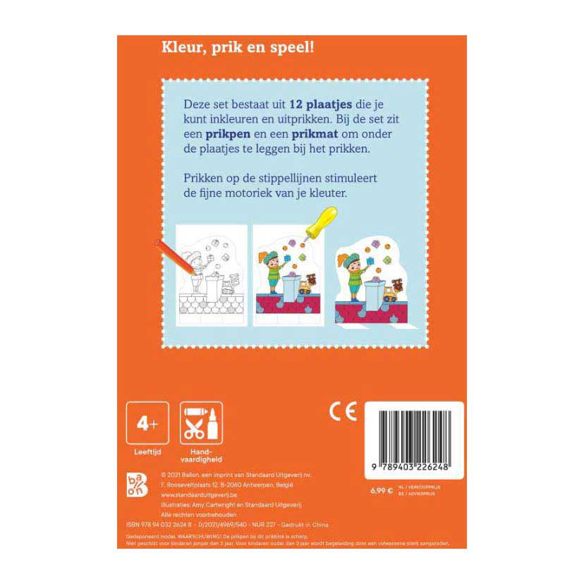 Deze set bestaat uit 12 plaatjes die je kunt inkleuren en uitprikken. Bij de set zit een prikpen en een prikmat om onder de plaatjes te leggen bij het prikken. Prikken op de stippellijnen stimuleert de fijne motoriek van je kleuter.