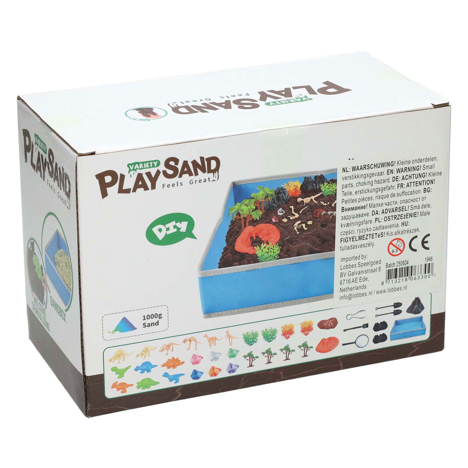 Deze speelset bevat 1000 gram bruin speelzand, diverse dinofiguren, vulkanen, fossielen, gereedschap en mallen. Alles zit in een handige doos met speelmat. Gemaakt van zand en kunststof. Geschikt voor kinderen vanaf 3 jaar oud.