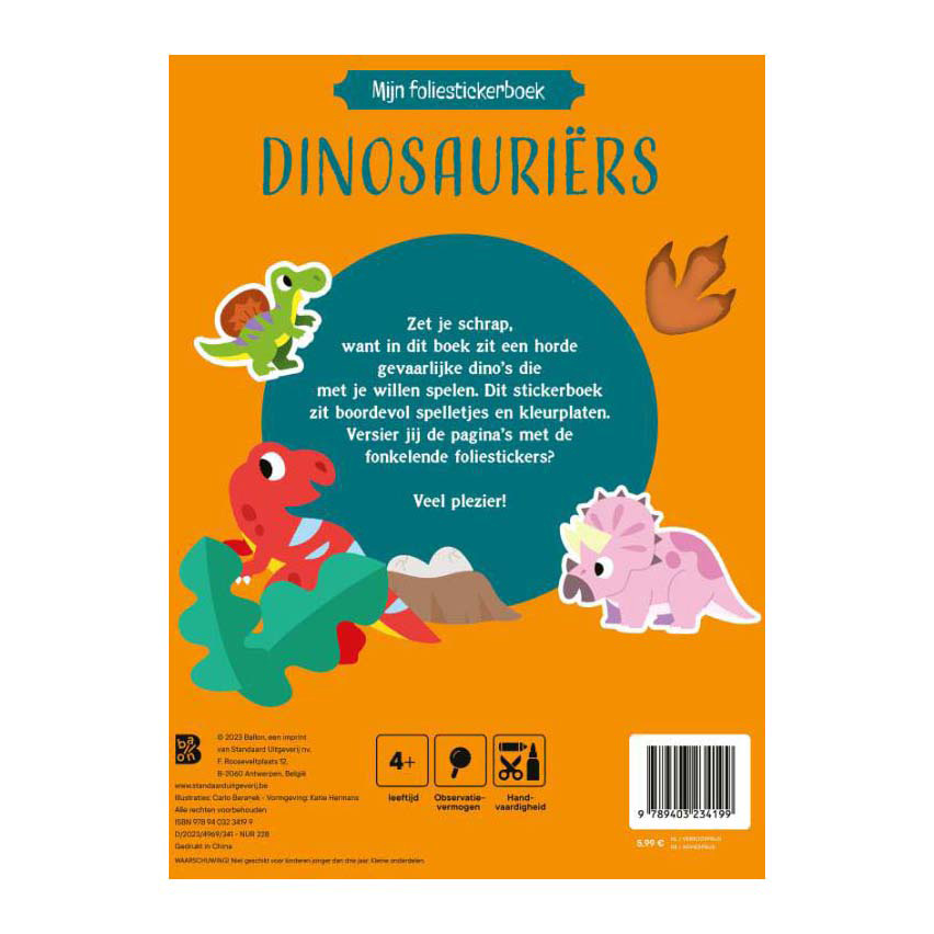 Zet je schrap, want in dit boek zit een horde gevaarlijke dino’s die met je willen spelen. Dit stickerboek zit boordevol spelletjes en kleurplaten. Versier jij de pagina’s met de fonkelende foliestickers? Pret verzekerd voor kinderen vanaf 4 jaar.
