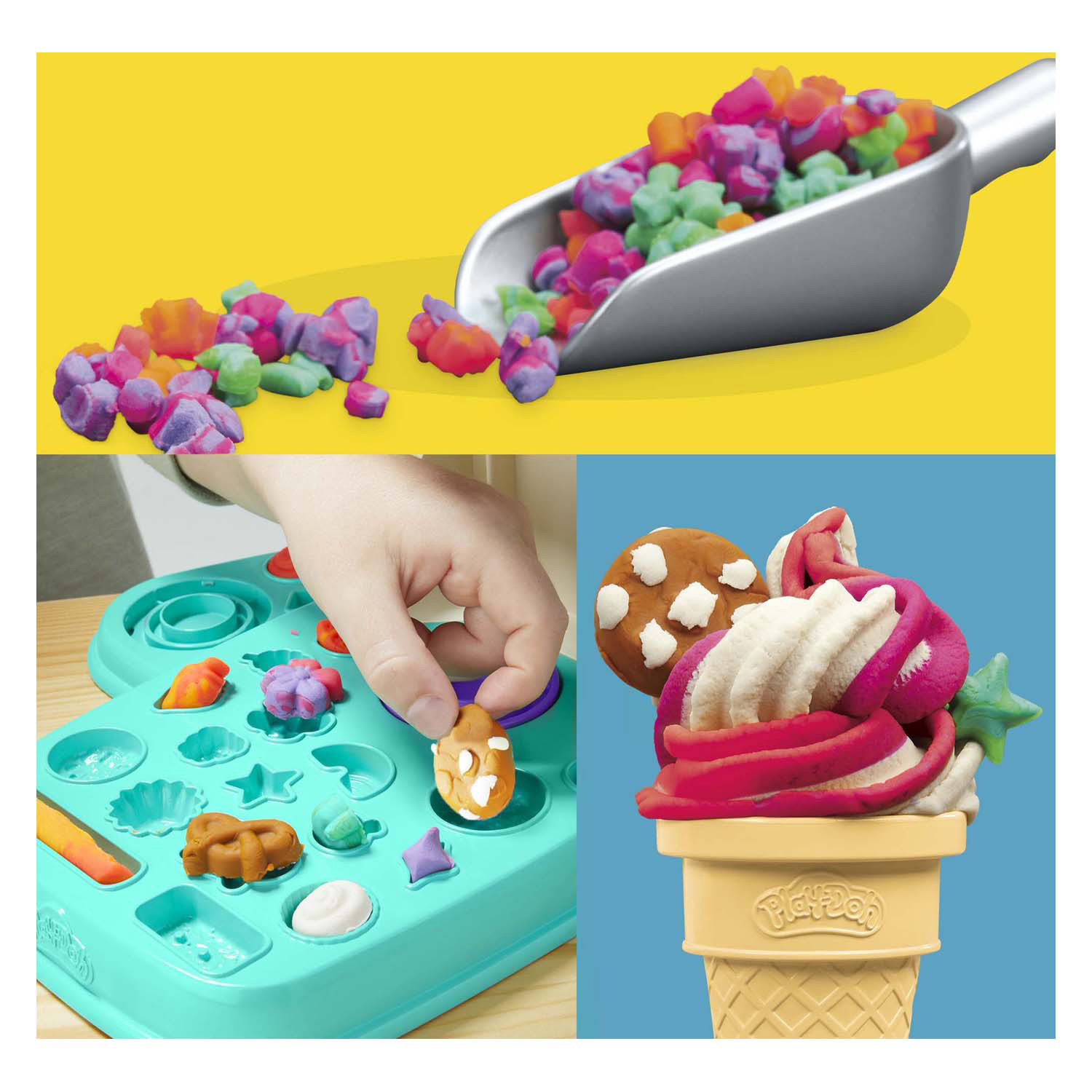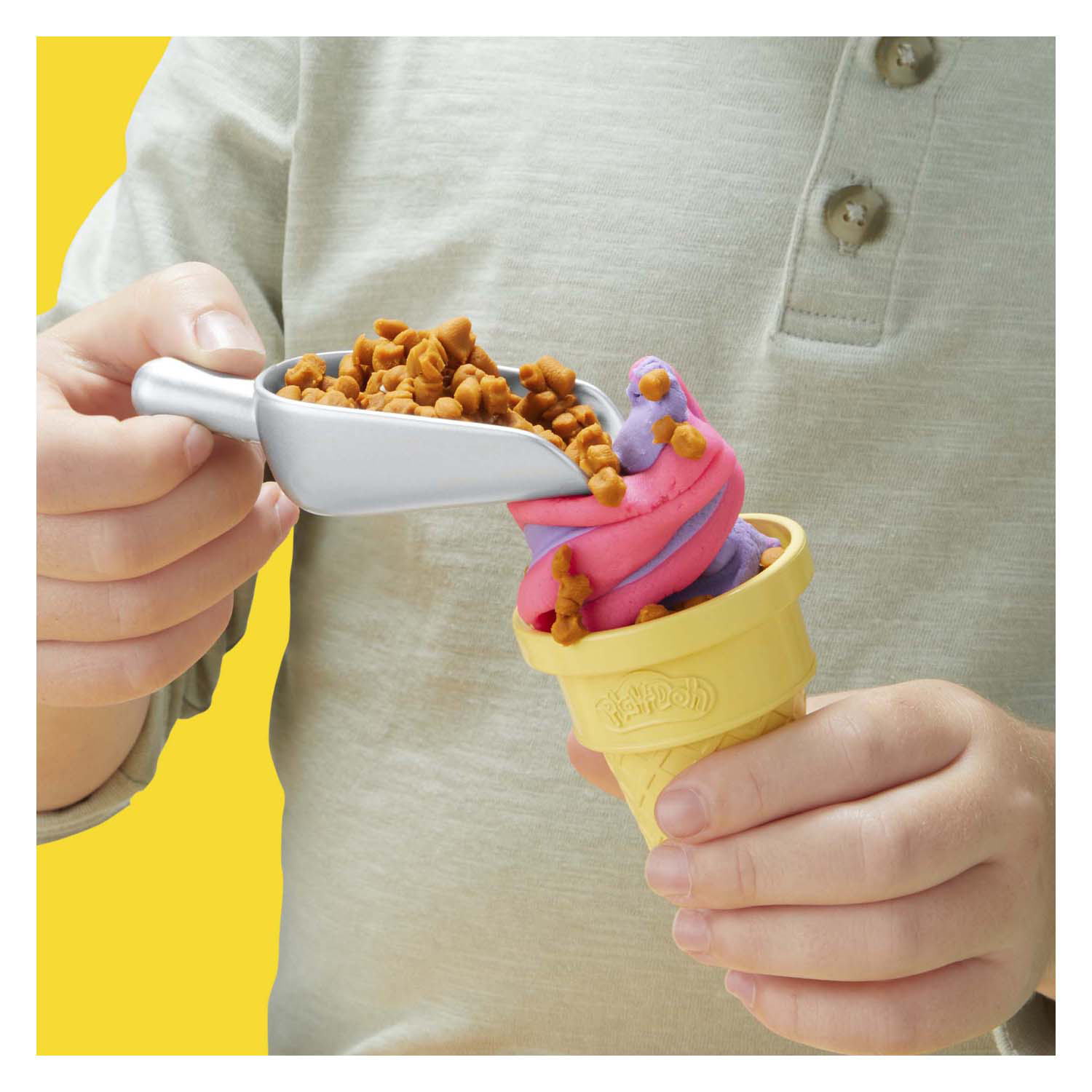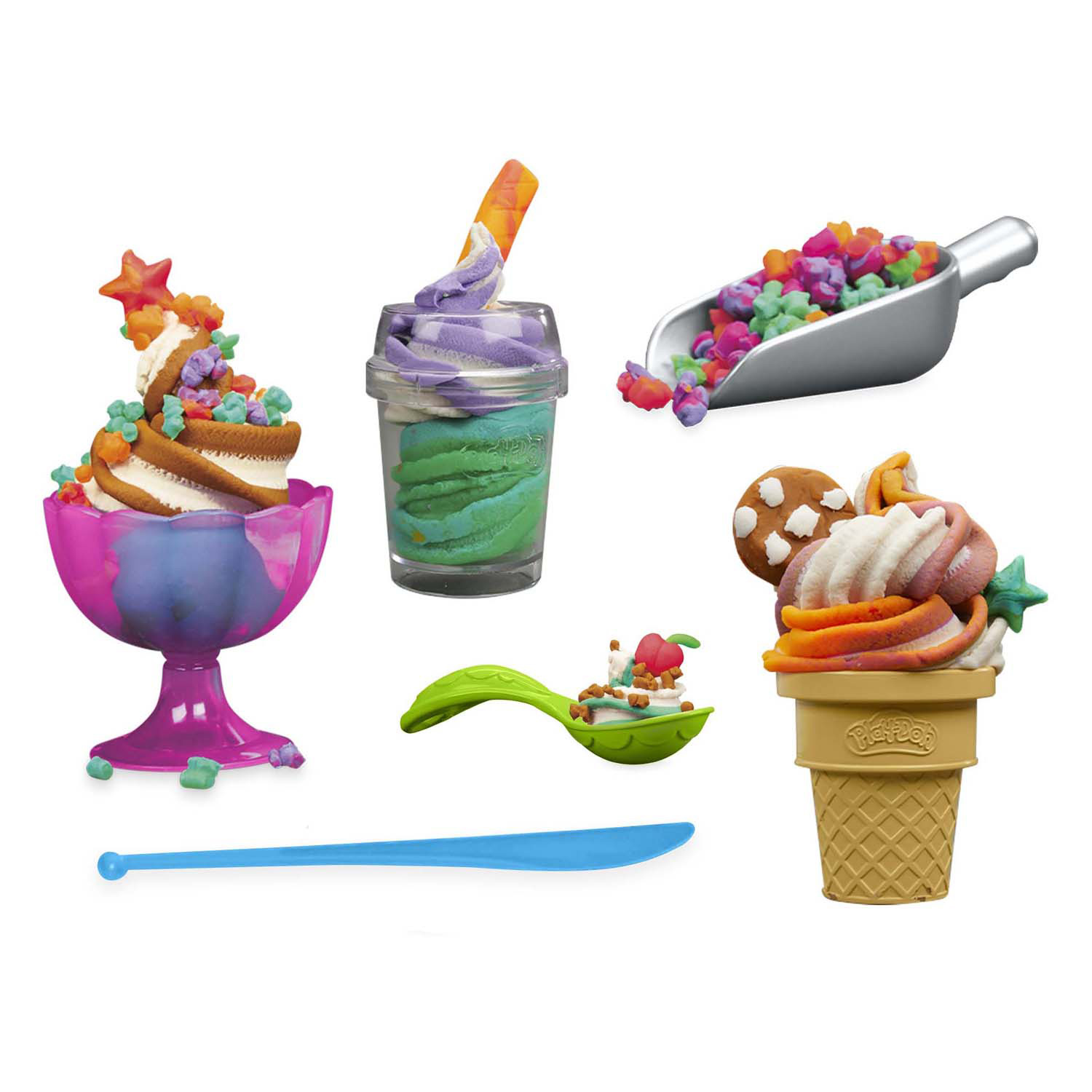 Fantasierijk spelen met de Play-Doh Rainbow softijsjes-speelset! Doe 2 of meer kleuren Play-Doh in de machine en druk op de hendel om de draaiende beker of het hoorntje te vullen met namaaksoftijs met regenboogranden. Maak hagelslag en andere Play-Doh-etenswaren na, zoals pretzels, fleurig fruit en snoep om te gebruiken als versiering. Bij deze speelgoed-ijsjesset horen een lepel, speelgoedmesje, hagelslagschep, een ijscoupe, een hoorntje en beker met deksel, zodat kinderen ijswinkeltje kunnen spelen en doen alsof ze hun Play-Doh-creaties serveren. Deze Play-Doh-set bevat 284 gram Play-Doh-boetseerklei, inclusief 3 potjes met 2 kleuren om meerkleurige ijsjes en decoraties te maken. Speelgoedkeukenapparaten zoals deze Play-Doh-keukenset voor kinderen, zijn ideale cadeaus voor meisjes en jongens vanaf 3 jaar. PLAY-DOH en HASBRO en alle gerelateerde handelsmerken en logo's zijn handelsmerken van Hasbro, Inc.