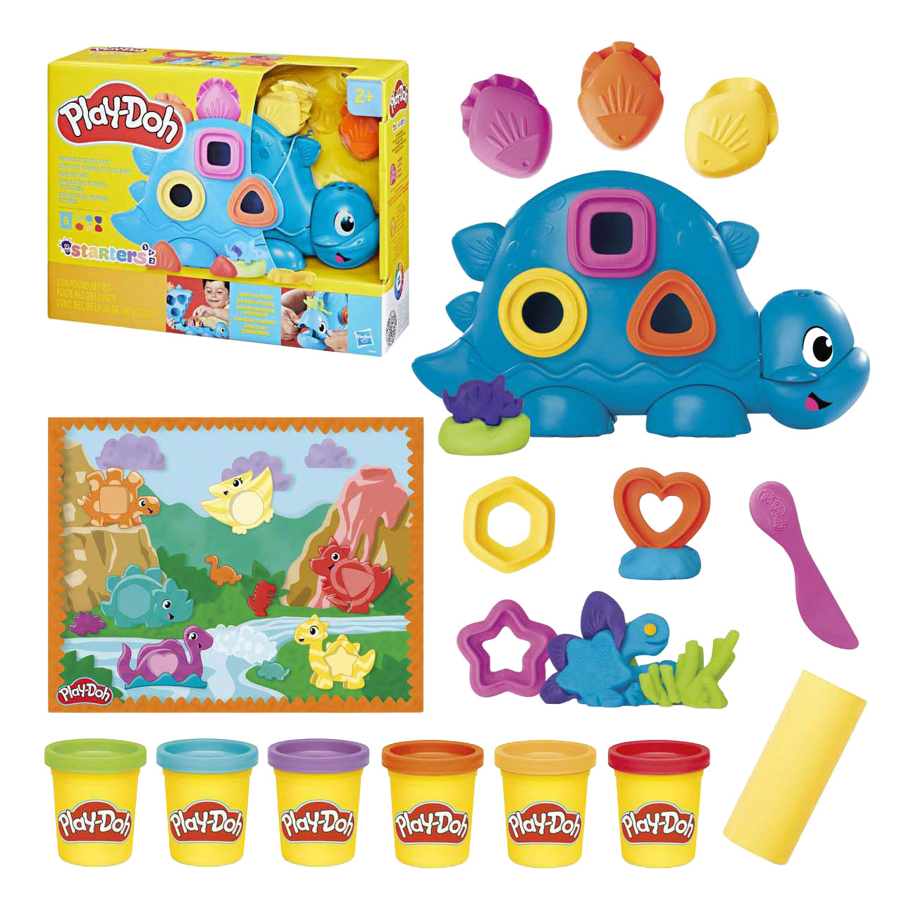 Het is tijd voor een dinosaurusfeestje met Play-Doh Dino-vormen en -kleuren! Deze peuterspeelset bevat verschillende leuke activiteiten met een lief dinovriendje. Verschillende vormen uitsteken en rollen met Play-Doh-accessoires. Het gereedschap berg je op in de handige dino of je hangt het aan de zijkant van deze kinderspeelset. De speelmat biedt leuke matchingactiviteiten, die kinderen ook helpen hun Play-Doh-creaties van de tafel te houden. Het is geweldig verbeeldingsspeelgoed dat kinderen helpt fijne motorische vaardigheden te oefenen en vormen en kleuren te ontdekken met tactiel sensorisch spelen. Dinosaurusspeelgoed voor jongens en meisjes is nu nog kleurrijker! PLAY-DOH en HASBRO en alle gerelateerde handelsmerken en logo's zijn handelsmerken van Hasbro, Inc.
