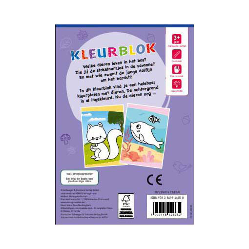 Kleurblok met dieren in hun leefomgeving, zoals bos, savanne en zee. Achtergronden zijn voorgedrukt; kinderen kleuren de dieren in. Geschikt vanaf 3 jaar. Gemaakt van kringlooppapier.