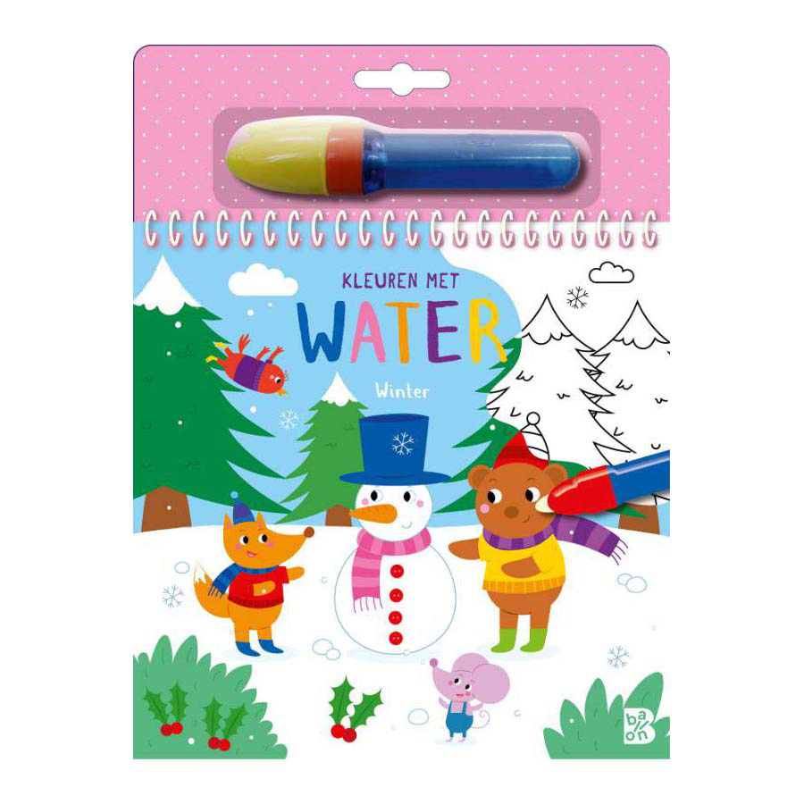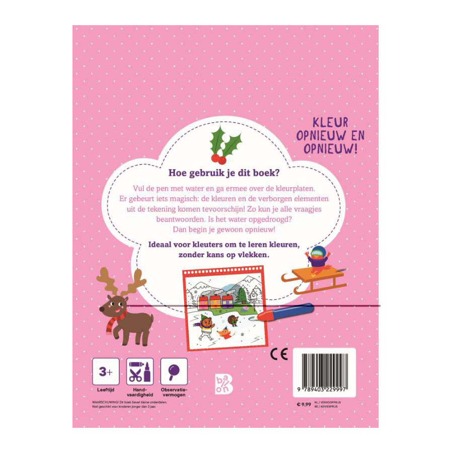 Vul de pen met water en ga ermee over de kleurplaten vol wintertaferelen. Er gebeurt iets magisch: de kleuren en de verborgen elementen uit de tekening komen tevoorschijn! Zo kun je alle zoekvraagjes beantwoorden. Is het water gedroogd? Dan begin je gewoon opnieuw! Ideaal voor kleuters om te leren kleuren, zonder kans op vlekken.
