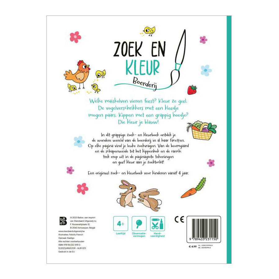 In dit grappige zoek- en kleurboek ontdek je de wondere wereld van de boerderij in al haar facetten. Op elke pagina vind je leuke zoekvragen. Van de boomgaard en de schapenweide tot het kippenhok en de ranch: trek erop uit in de paginagrote tekeningen en geef kleur aan je zoektocht!