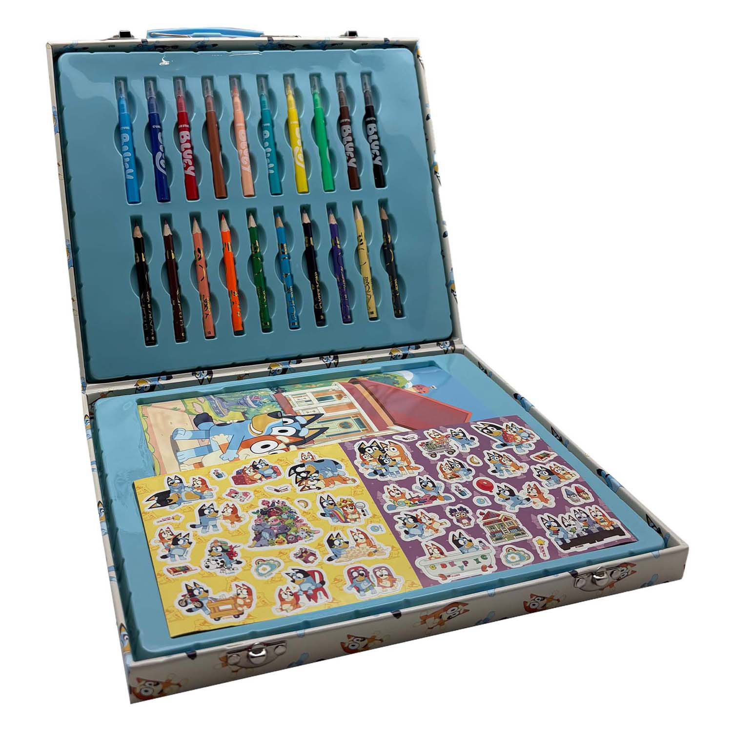De Bluey Activiteitenkoffer bevat 10 stiften, 10 potloden, 30 stickers en een kleurboek van 32 pagina’s in een stevige koffer. Ideaal voor creatieve kinderen vanaf 3 jaar oud. Gemaakt van papier en kunststof, met vrolijke Bluey-afbeeldingen.