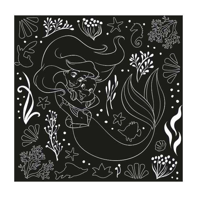 Laat je creativiteit de vrije loop met de magische kraskaarten in deze map. Gebruik de houten kraspen om de bovenste zwarte laag weg te krassen en Sneeuwwitje, Ariel, Assepoester en nog veel meer bekende karakters komen tevoorschijn!