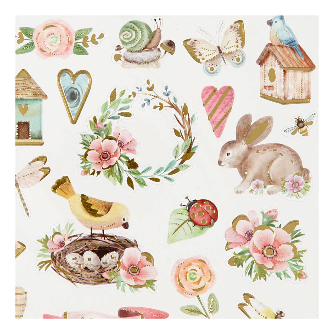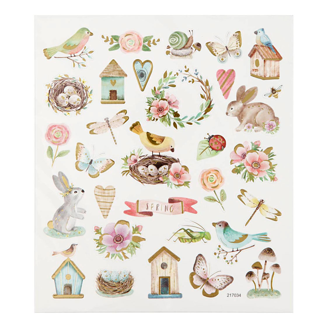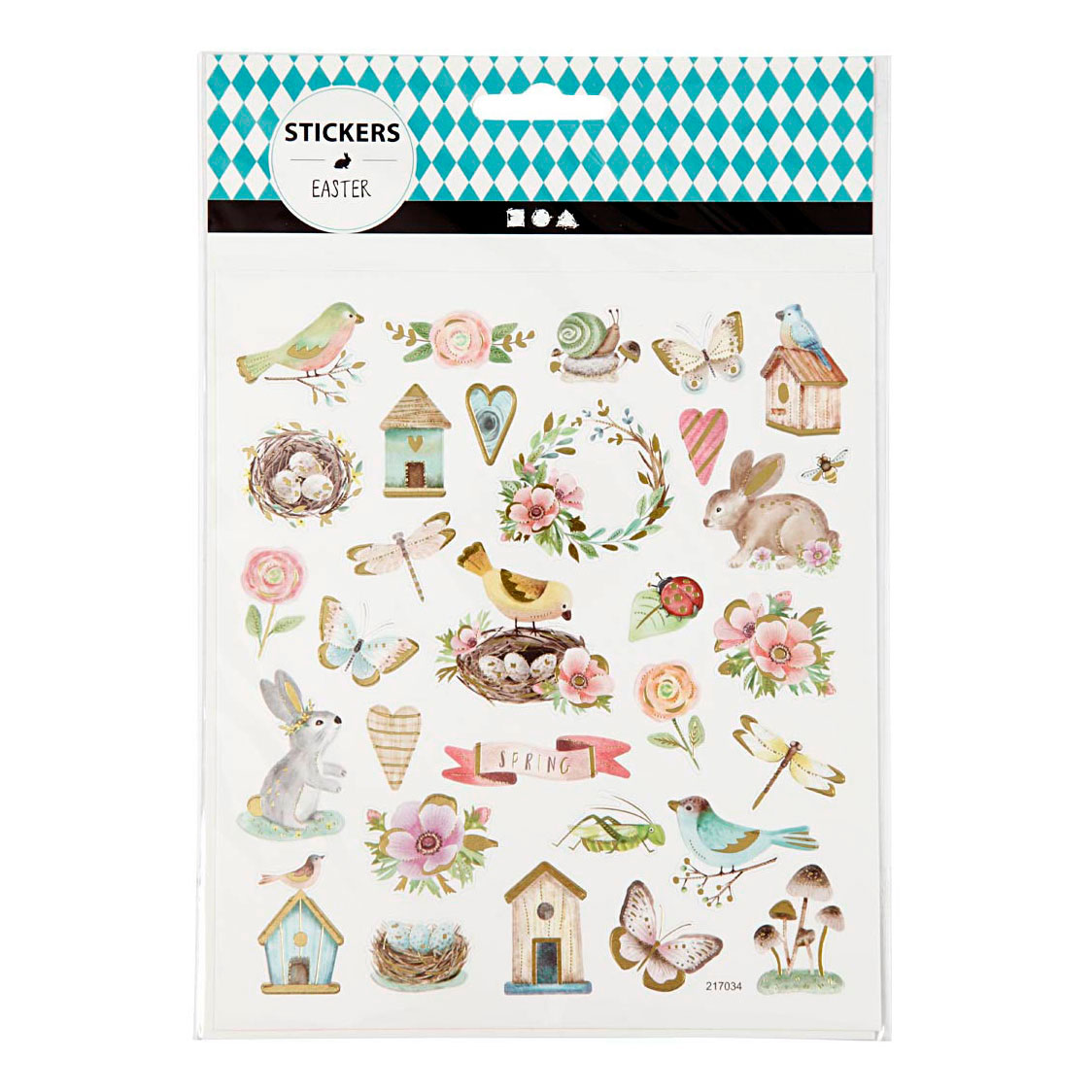 Stickervel van 15 x 16,5 cm met allerlei voorjaars- en Paasfiguren zoals vogels, bloemen en konijntjes. Het vel bevat diverse stickers die perfect zijn voor knutselen, decoreren en versieren. Geschikt voor kinderen vanaf 3 jaar oud.