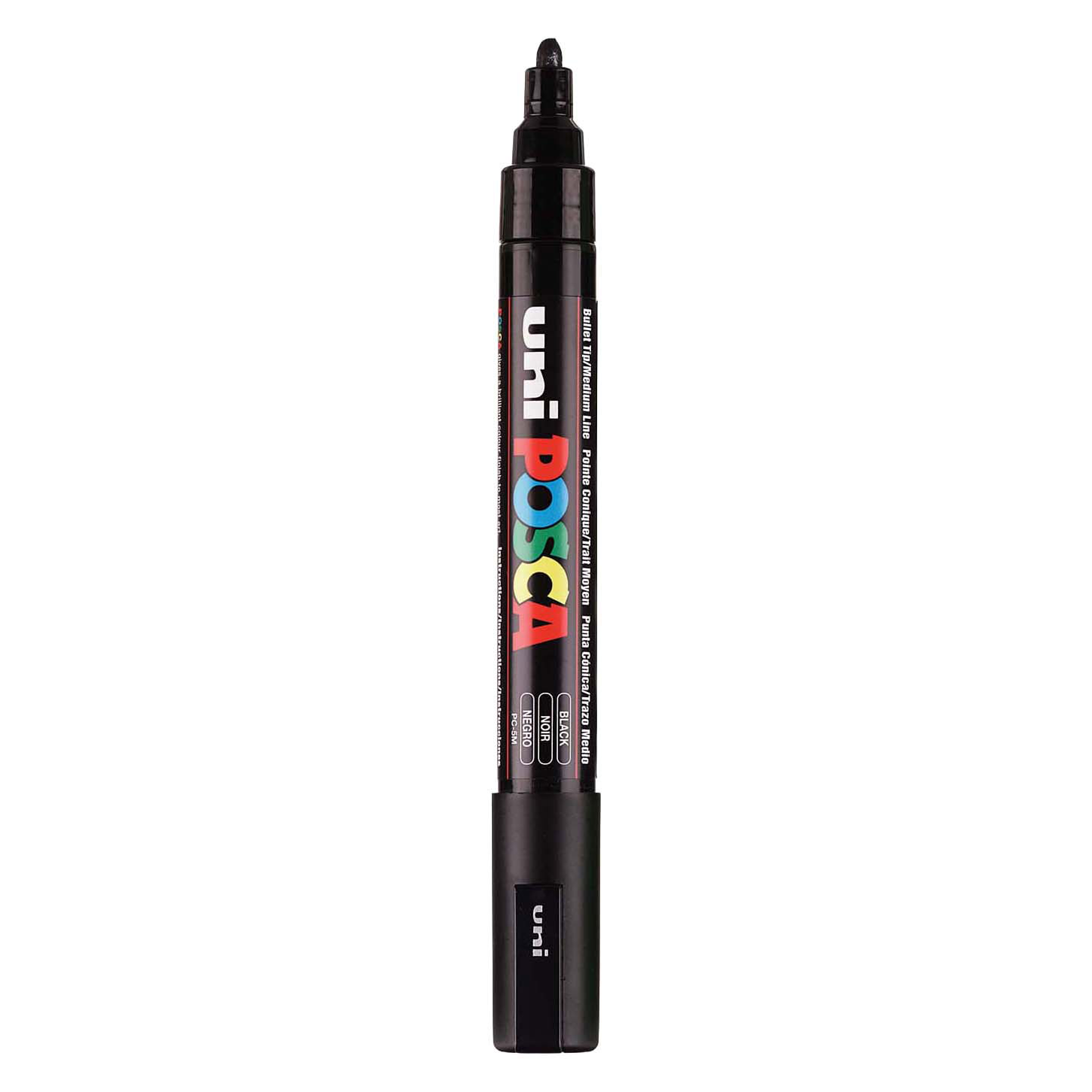 Zwarte Uni Posca PC5M verfmarker met conische punt van 2,5 mm. De acrylverf hecht goed op karton, hout, textiel, metaal, glas en meer.