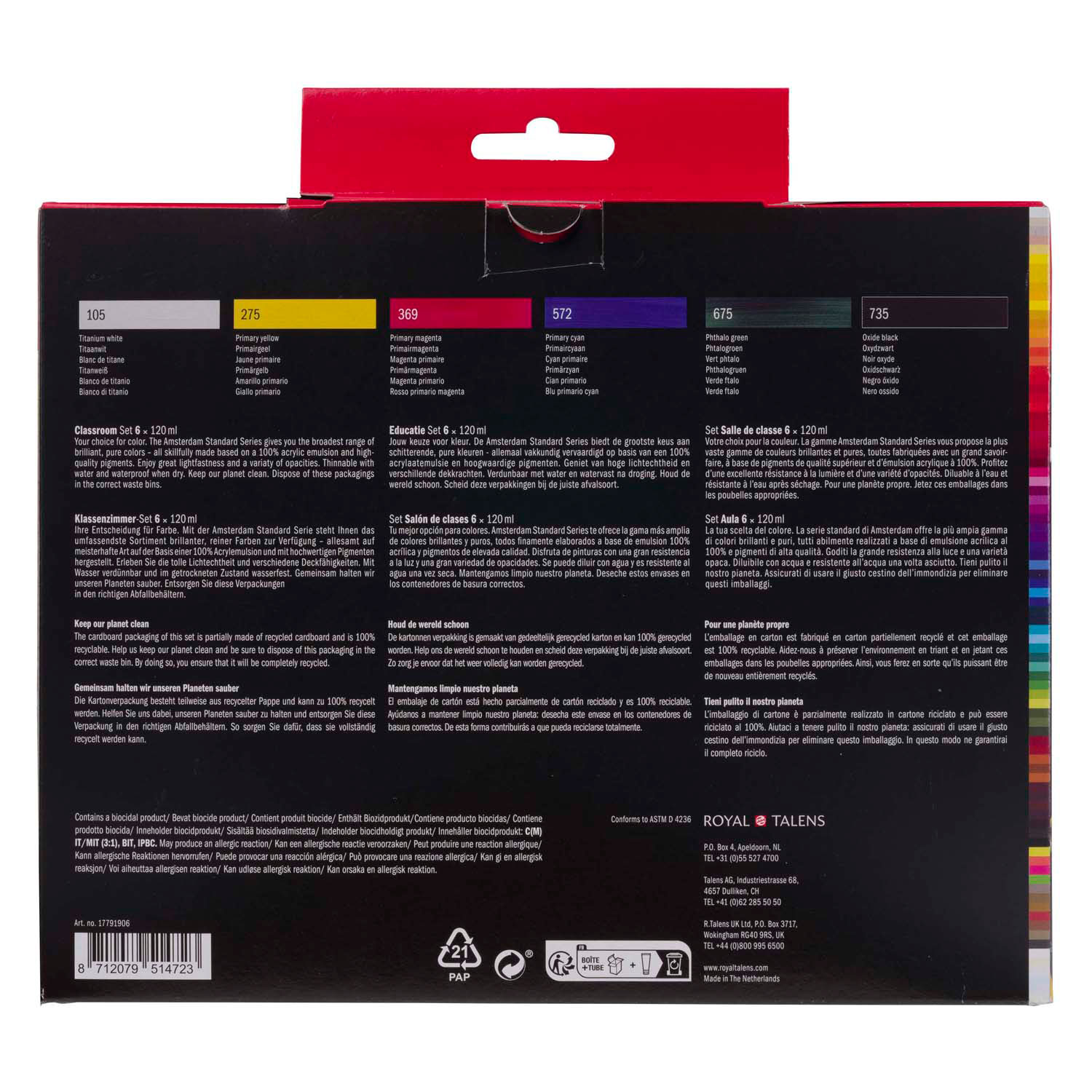 Inhoud: 6 x 120 ml tubes (105 Titaanwit – 275 Primairgeel – 369 Primairmagenta – 572 Primaircyaan – 675 Phtalogroen – 735 Oxydzwart).