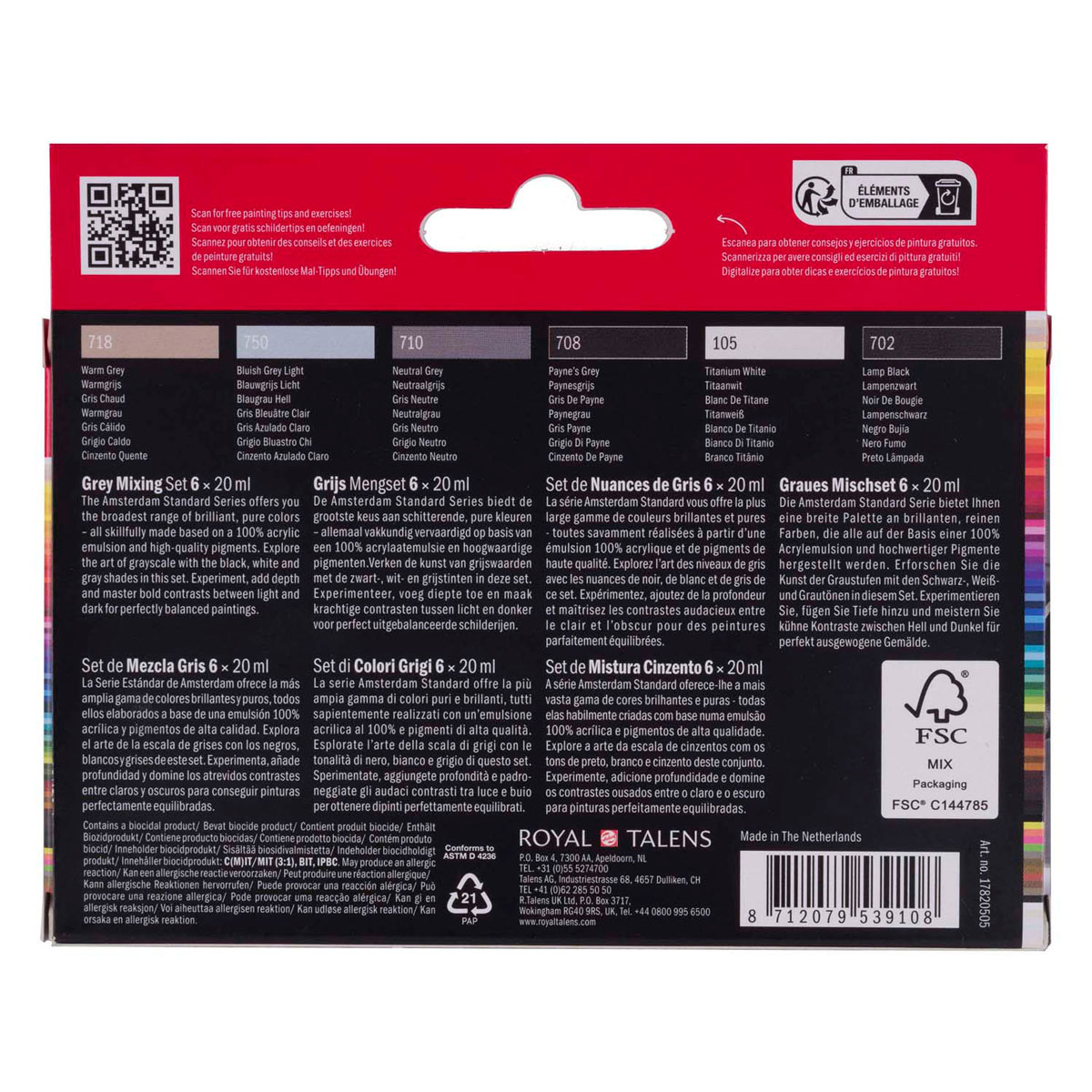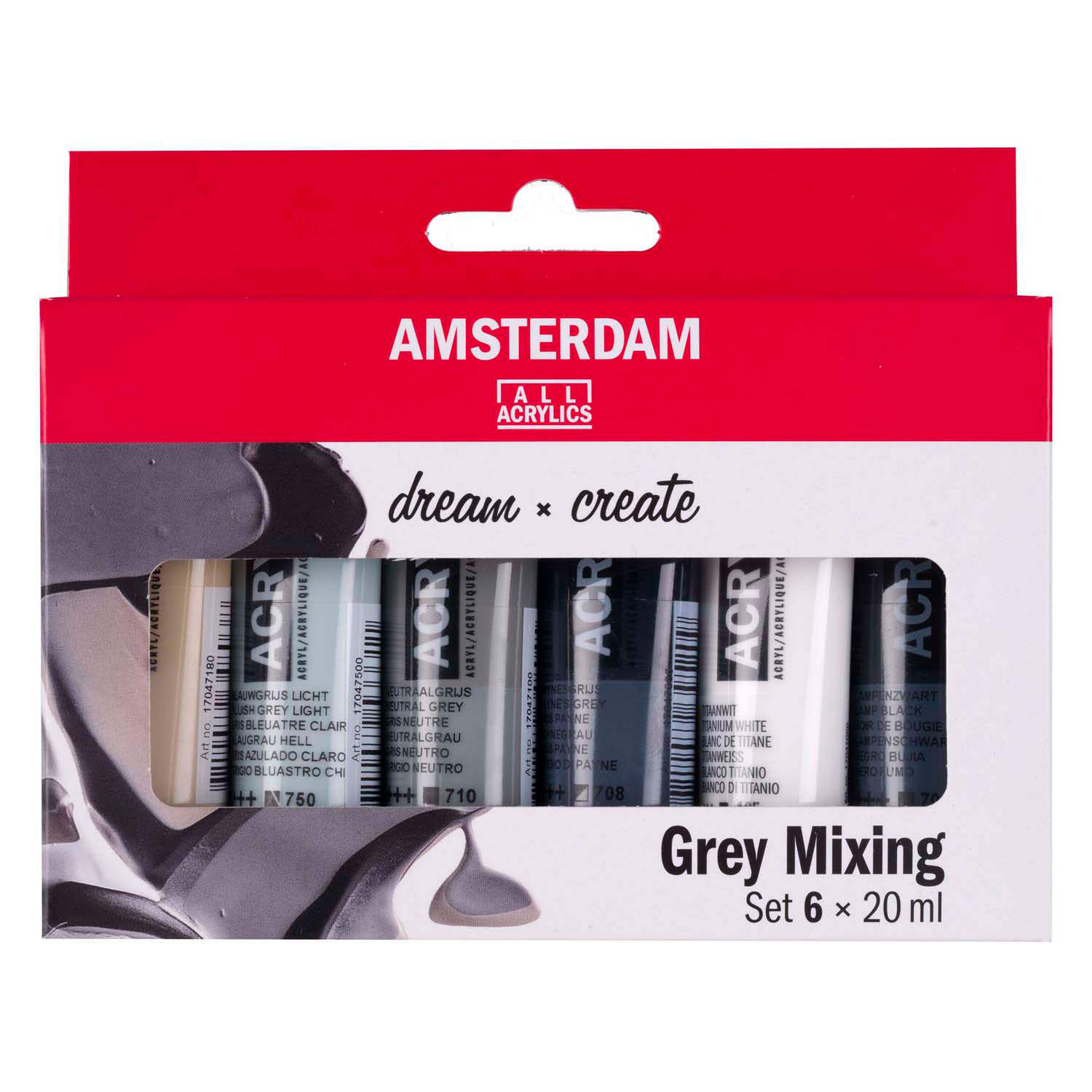 Inhoud: 6 x 20 ml tubes (718 Warmgrijs – 750 Blauwgrijs Licht – 710 Neutraalgrijs – 708 Paynesgrijs – 105 Titaanwit – 702 Lampenzwart).