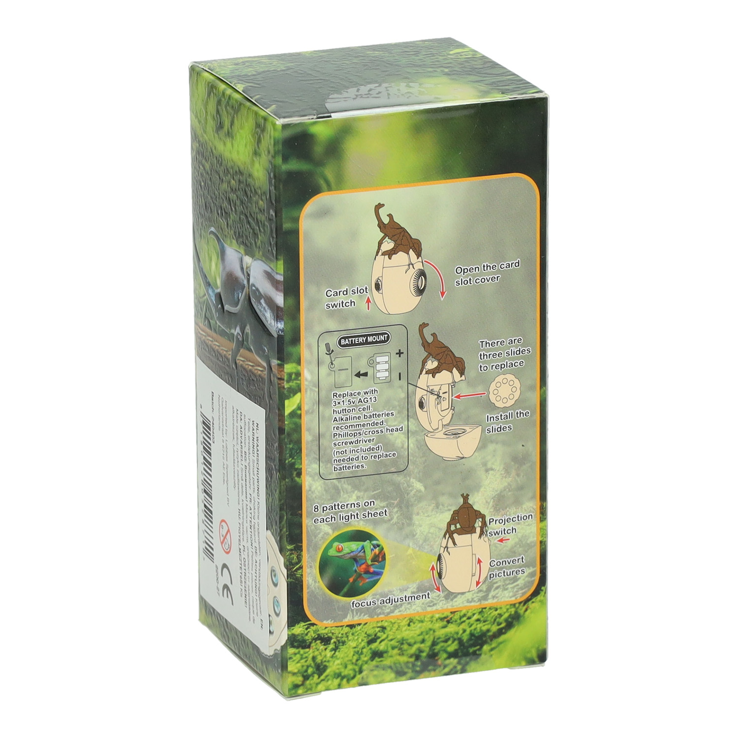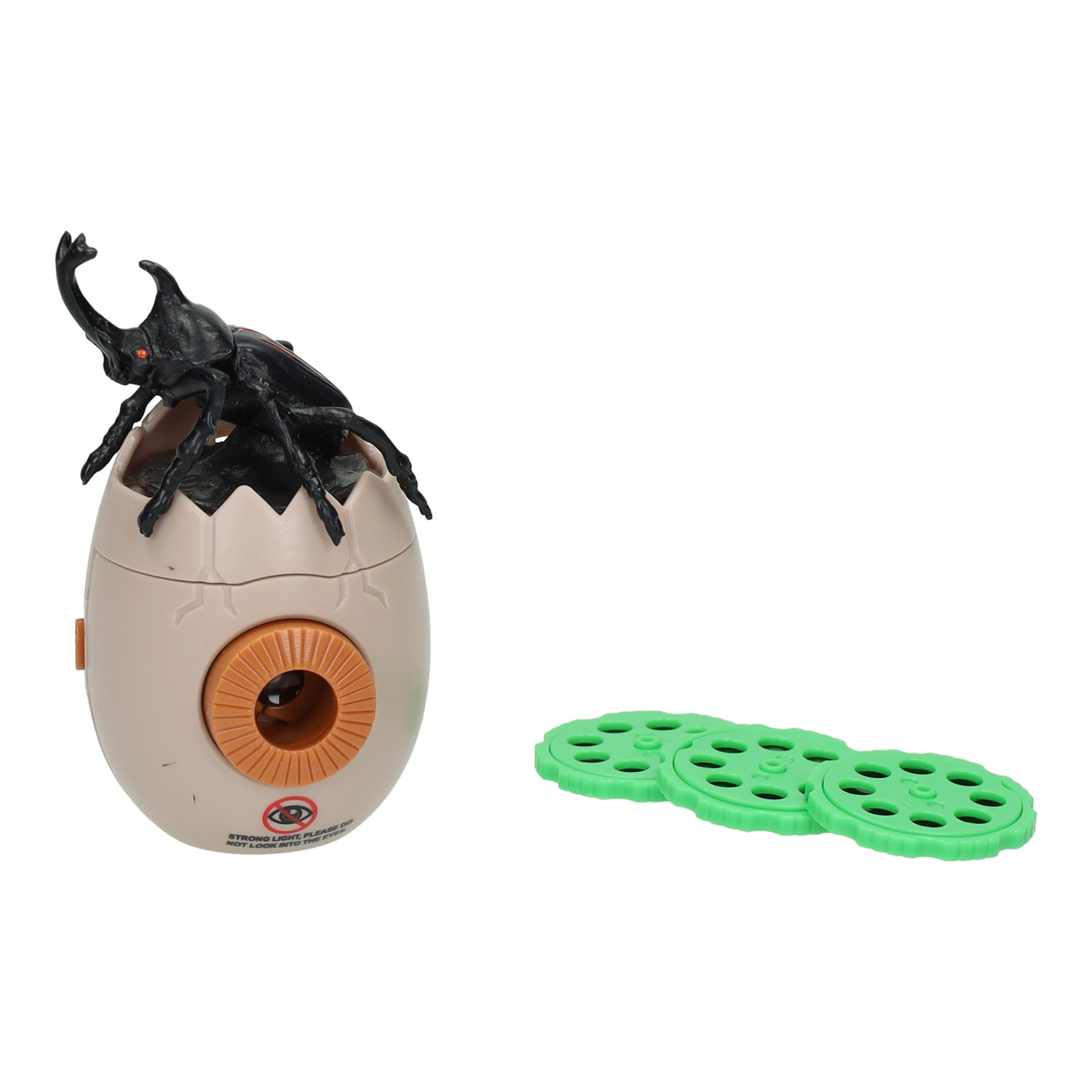 Inhoud: projector, 1 insect in ei (de projector), 3 projectie schijfjes, lus om om je hand te doen.