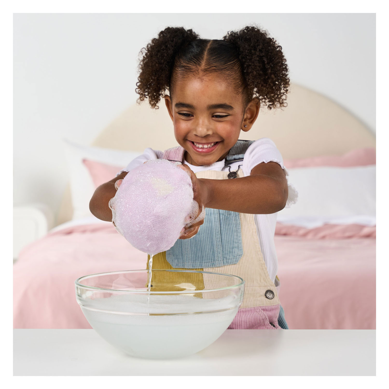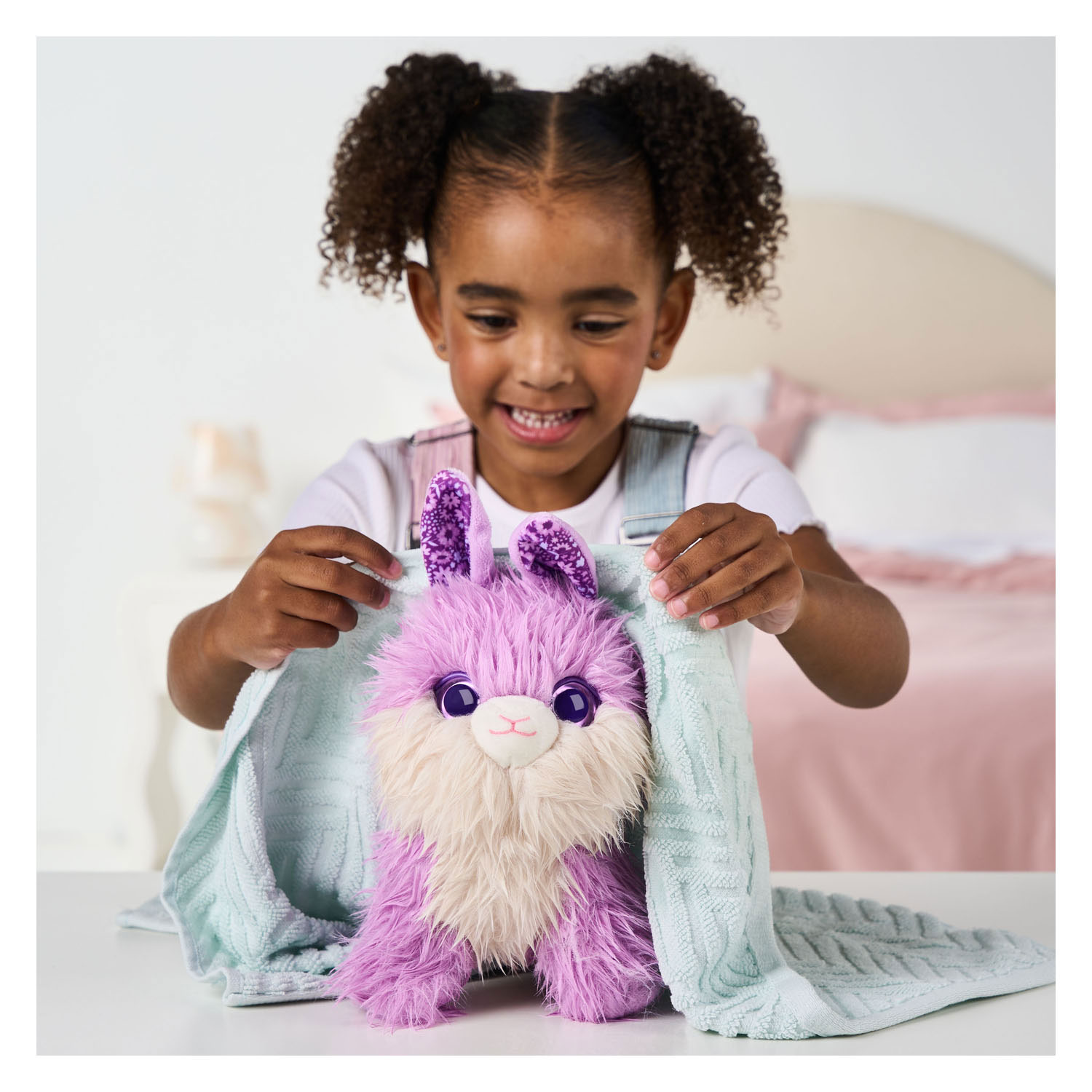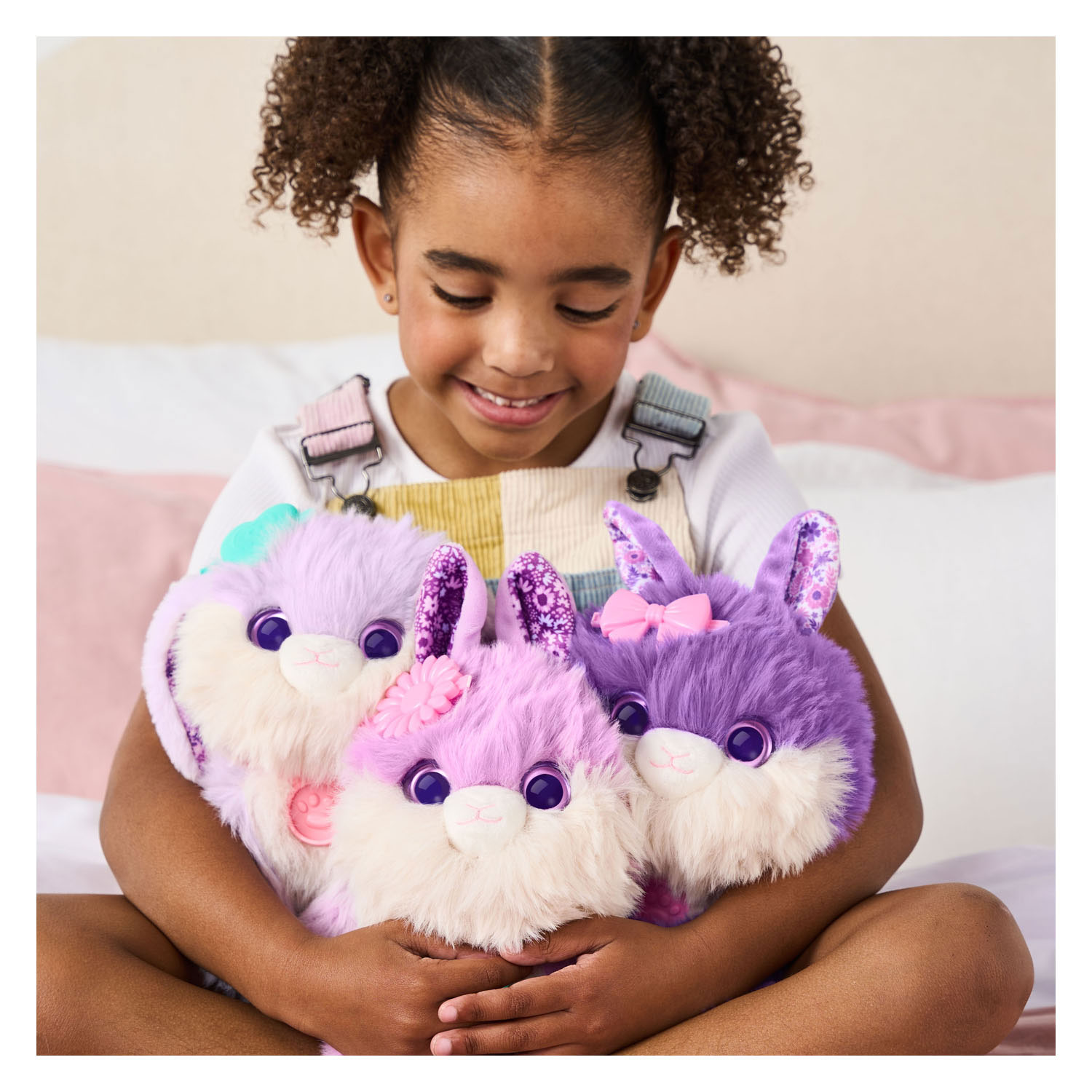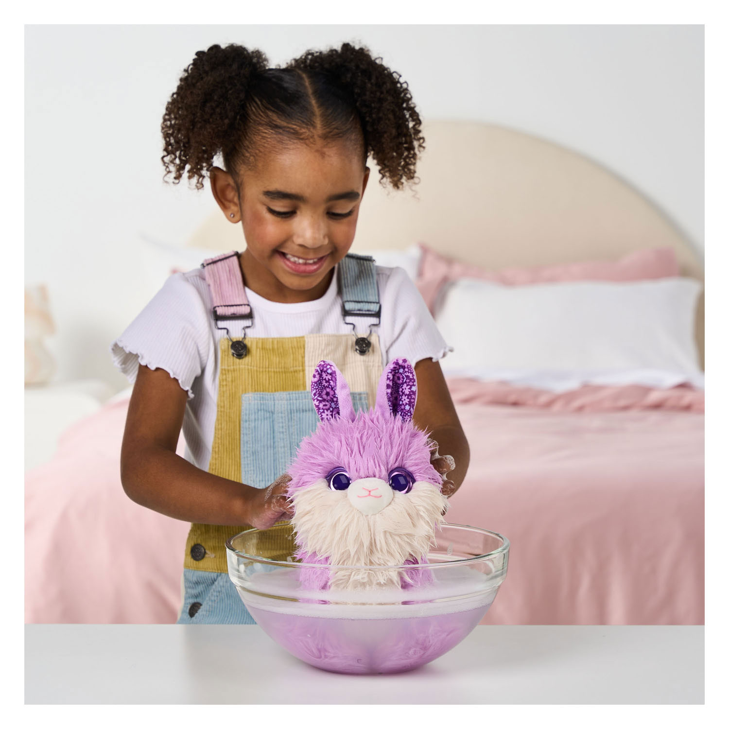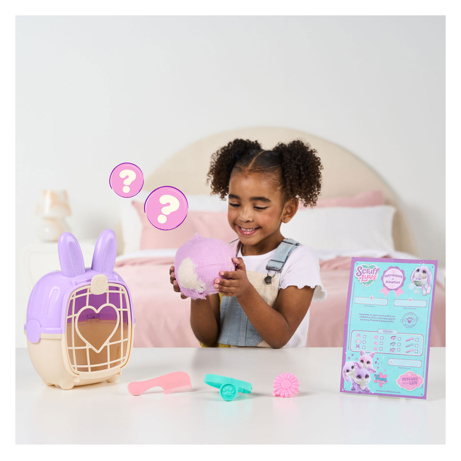 Ontdek je superzachte Scruff a Luvs mystery Knuffel! Het avontuur begint zodra je het geheimzinnige draagmandje met hartje en grote konijnenoren opent. Welke van de 3 paarse konijntjes zit erin verborgen? Maar alles wat je ziet is een grote, pluizige bal! Zodra je deze fluffy bal in warm water wast, komt het mysterieuze knuffeldiertje langzaam tevoorschijn. Het is een magische transformatie en je nieuwe huisdier is klaar om verzorgd te worden.