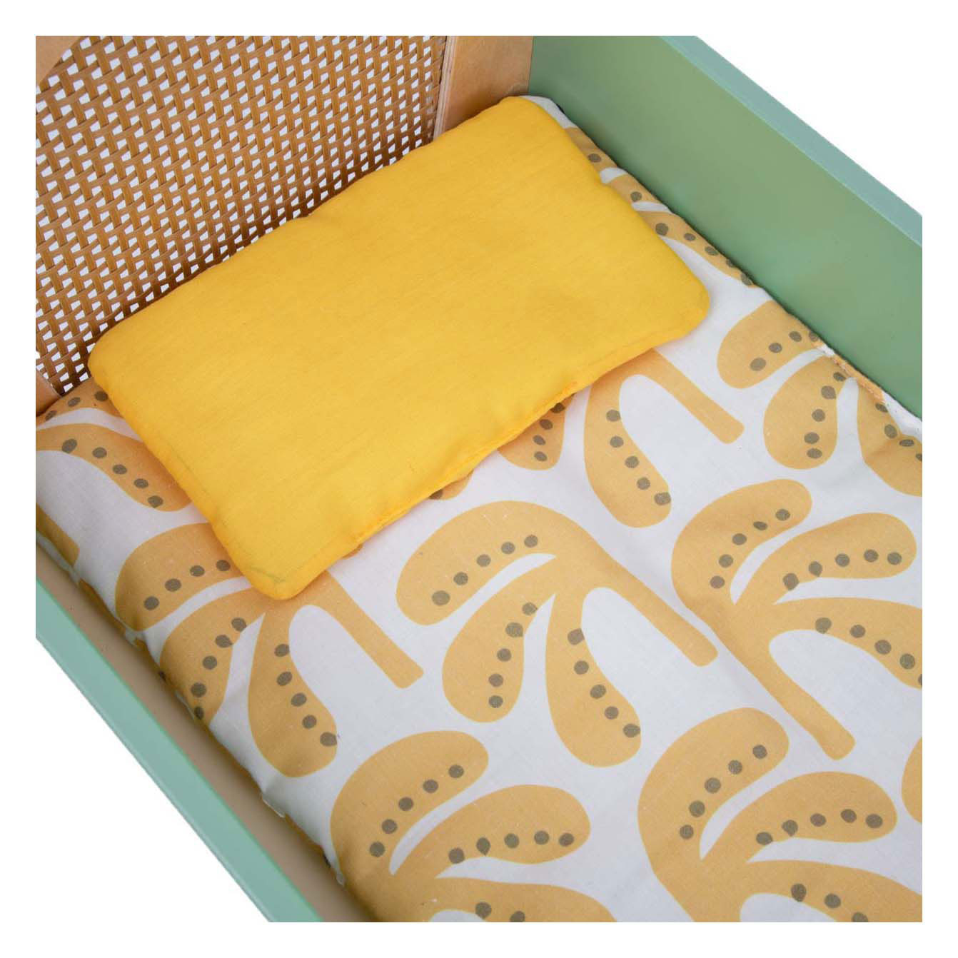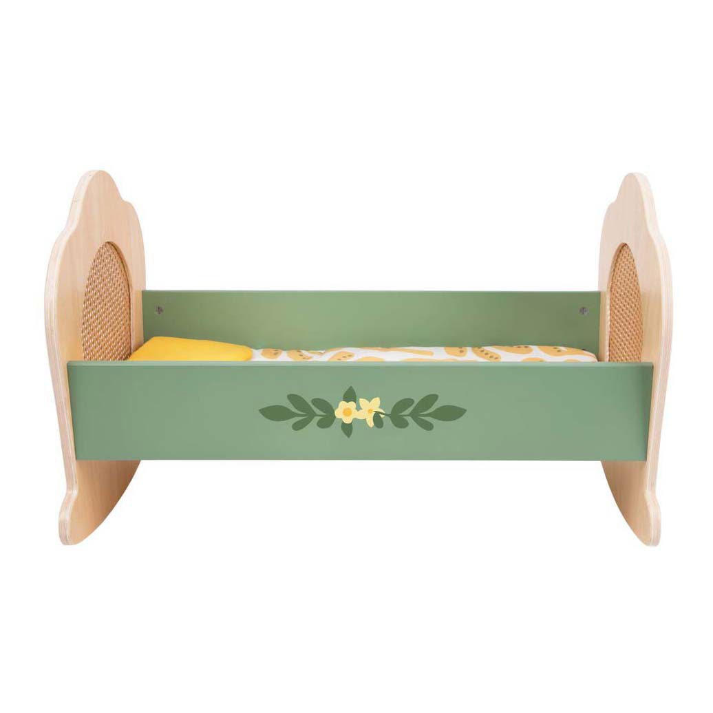 Vintage houten poppenwieg van Classic World in zachte groentinten. Gemaakt van FSC-gecertificeerd hout met rieten rugleuning en bloemenprint. Afmeting: 45 x 28 x 28,3 cm, geschikt vanaf 3 jaar.