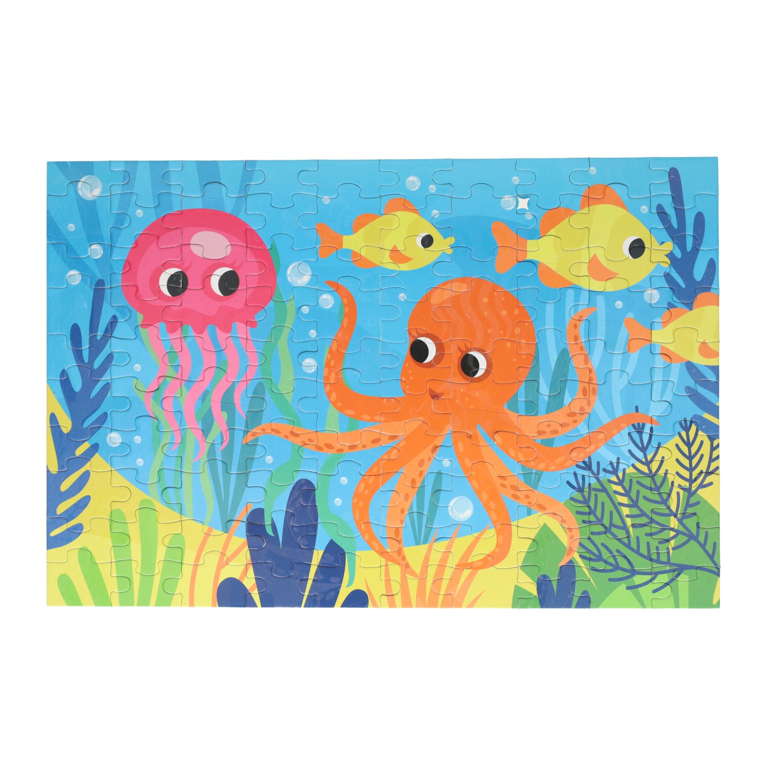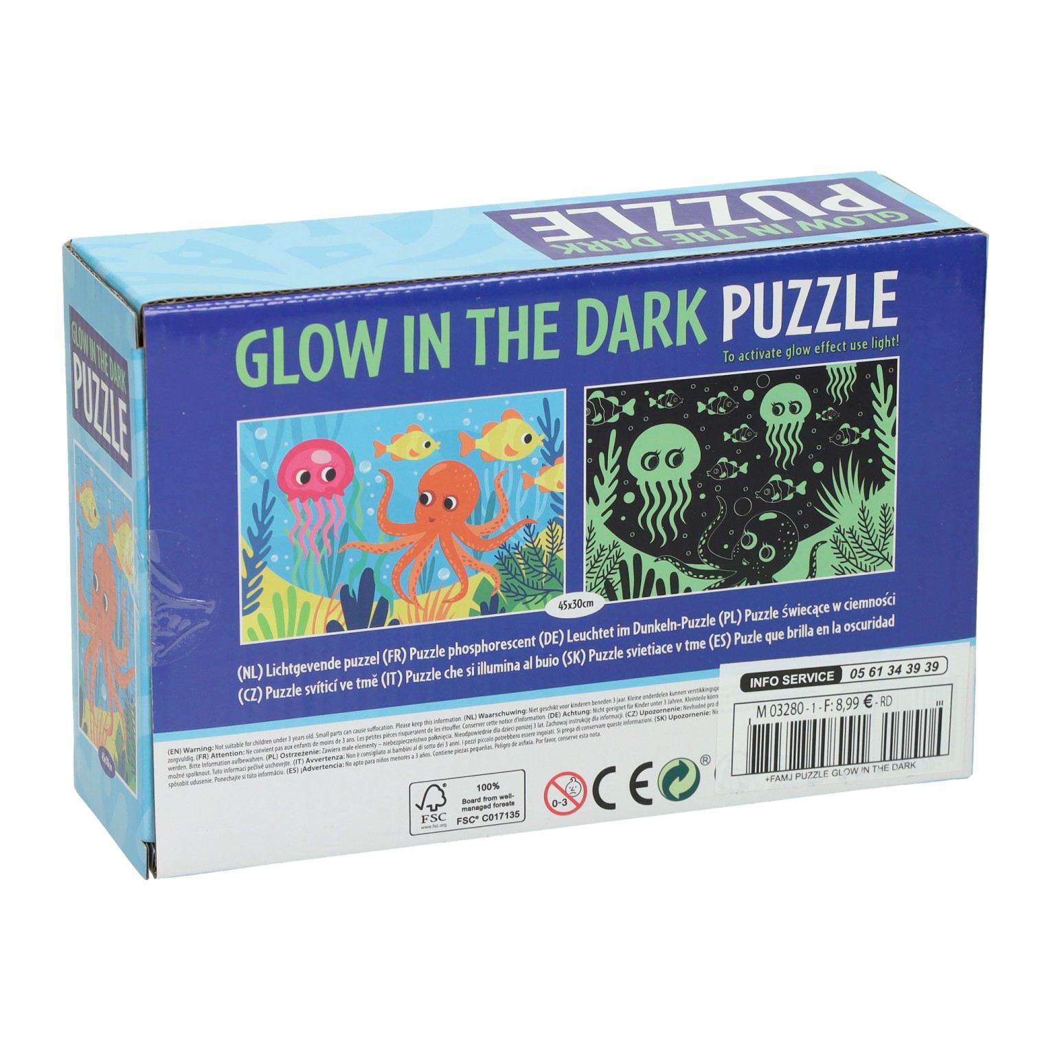 Puzzel in onderwaterthema, bestaande uit 100 stukjes. De puzzel heeft een glow in the dark effect en is gelegd 45 x 30 cm groot.