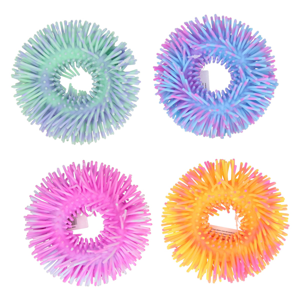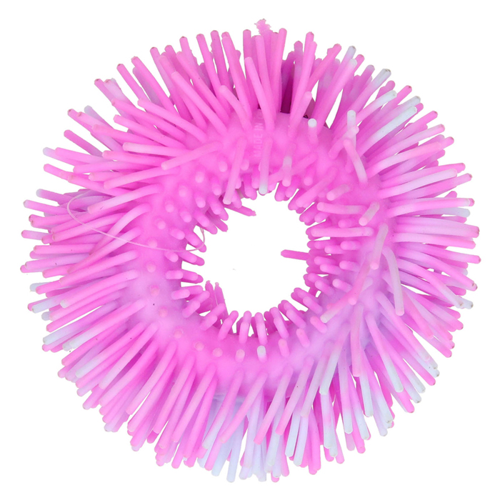 Pufferarmband met zachte, siliconen stekels. De armband is gemaakt van fijn, rekbaar materiaal dat prettig is om aan te raken en geschikt is om in te knijpen, aan te trekken en stress te verminderen. Geschikt voor kinderen vanaf 3 jaar.