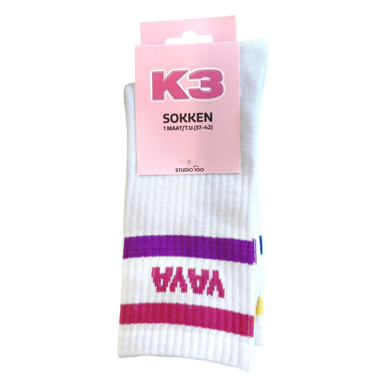 2 paar zachte, witte stretchy K3 sokken die leuk zijn om te geven, nóg leuker om te krijgen! De ene dag zingen je voeten TeleRomeo, de andere dag roepen ze vrolijk YaYaYippee! Deze sokken zijn één maat (37 t/m 42).