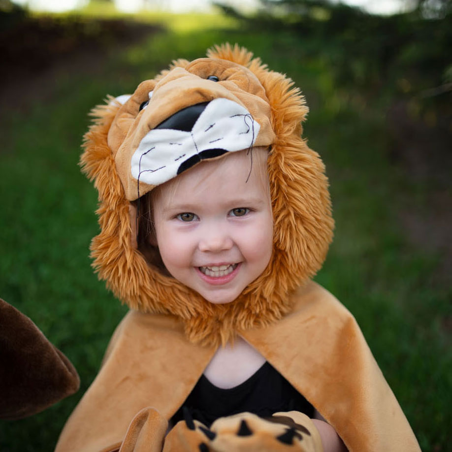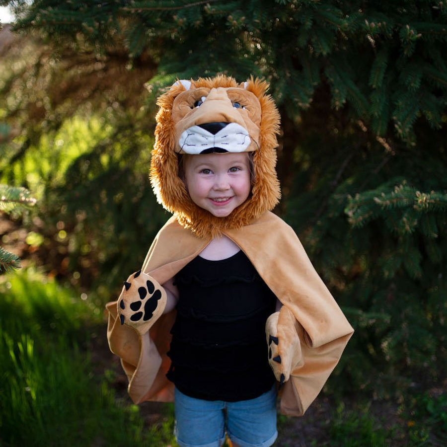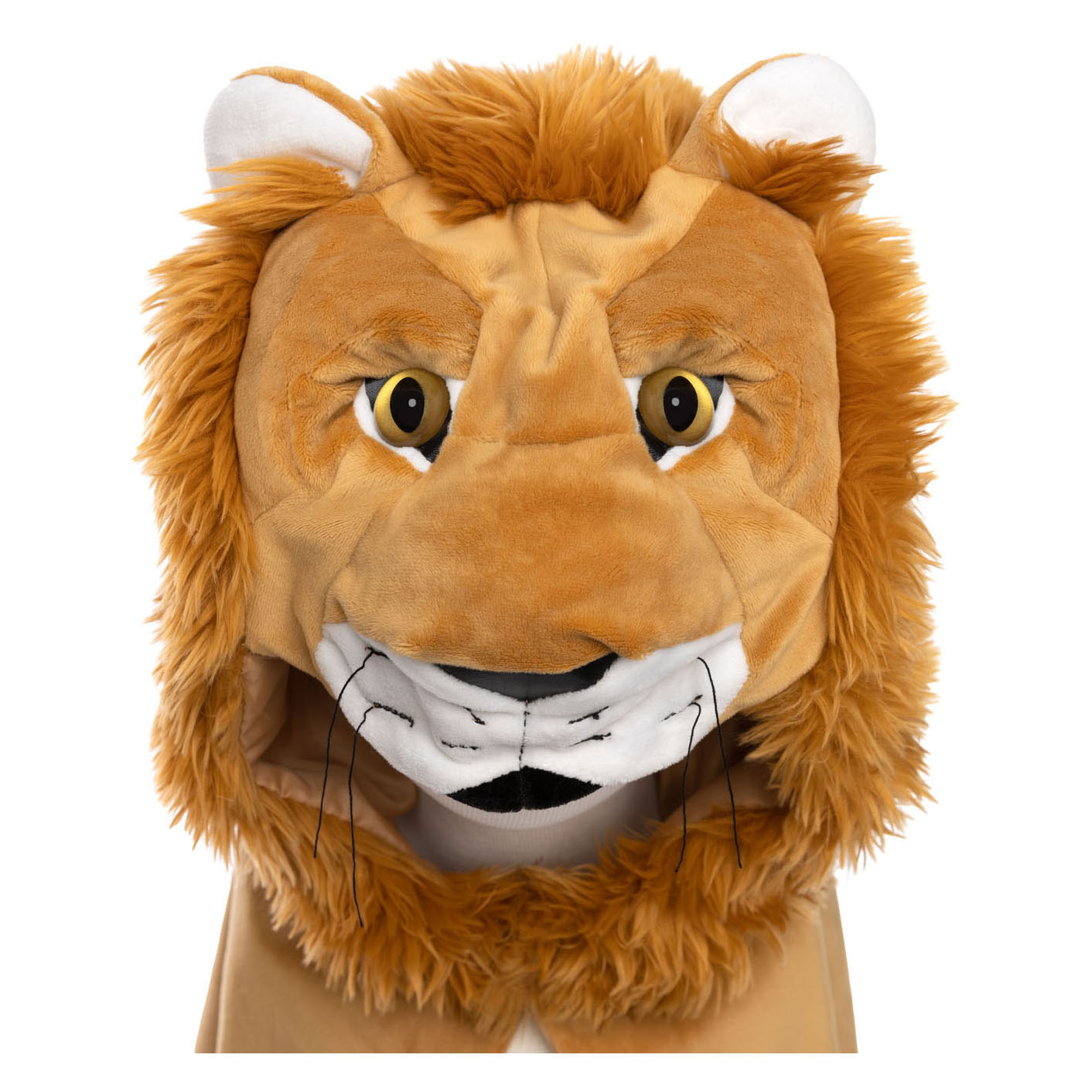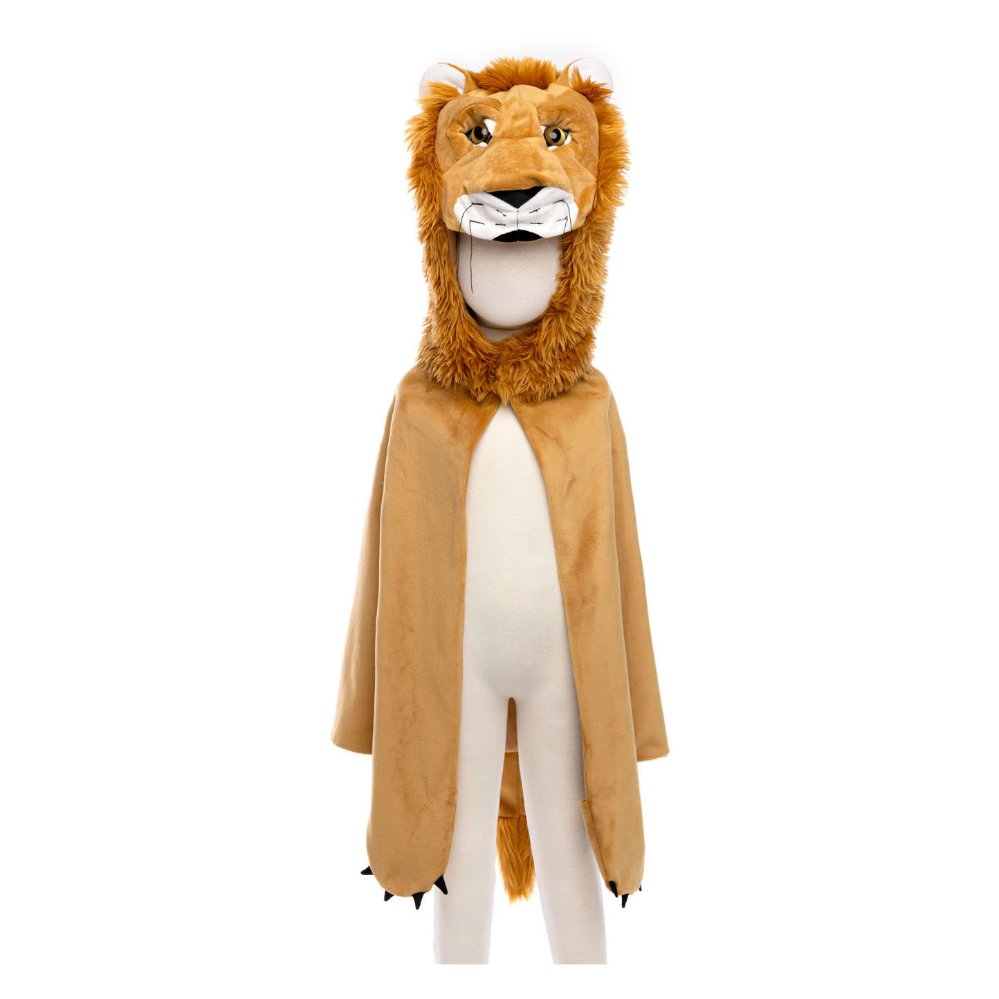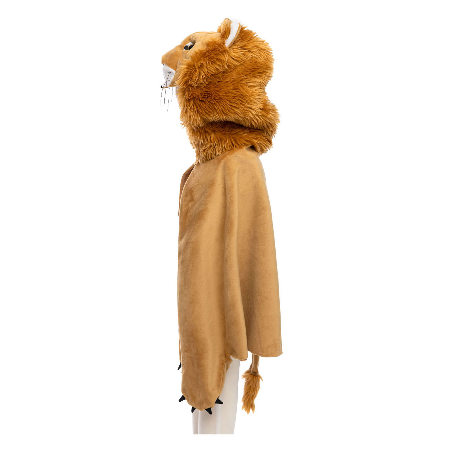 Leeuwencape met ingebouwde klauwen en staart op de rug. Geschikt voor kinderen van 4 tot 6 jaar oud.