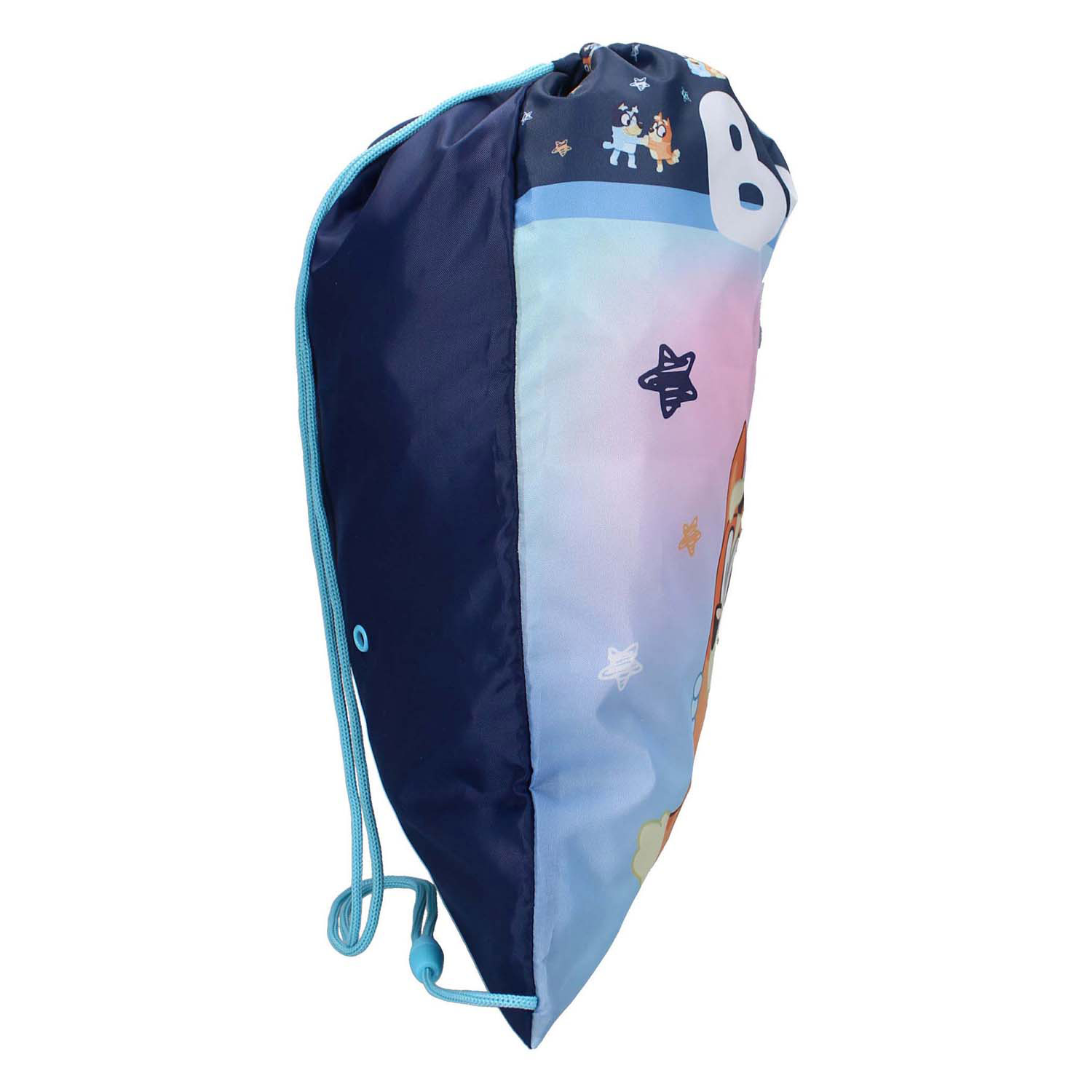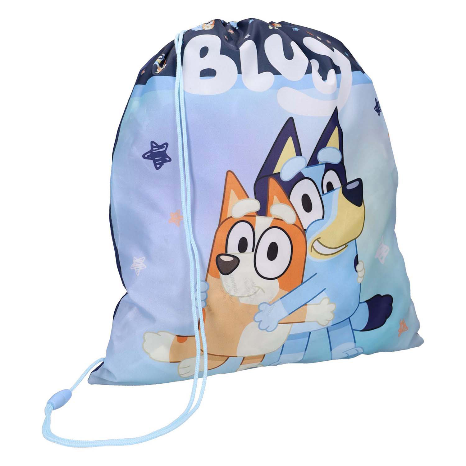 Met deze schattige gymtas uit de �??Smoochy Kiss�?� collectie van Bluey wil jouw kindje zeker gezien worden! De tas is uitgevoerd in een blauwe kleur en is versierd met een lieve Bluey print op de voorkant. Dankzij de praktische blauwe trekkoordjes is de gymtas eenvoudig open en dicht te maken. Ideaal voor gymles, zwemles of een dagje uit!