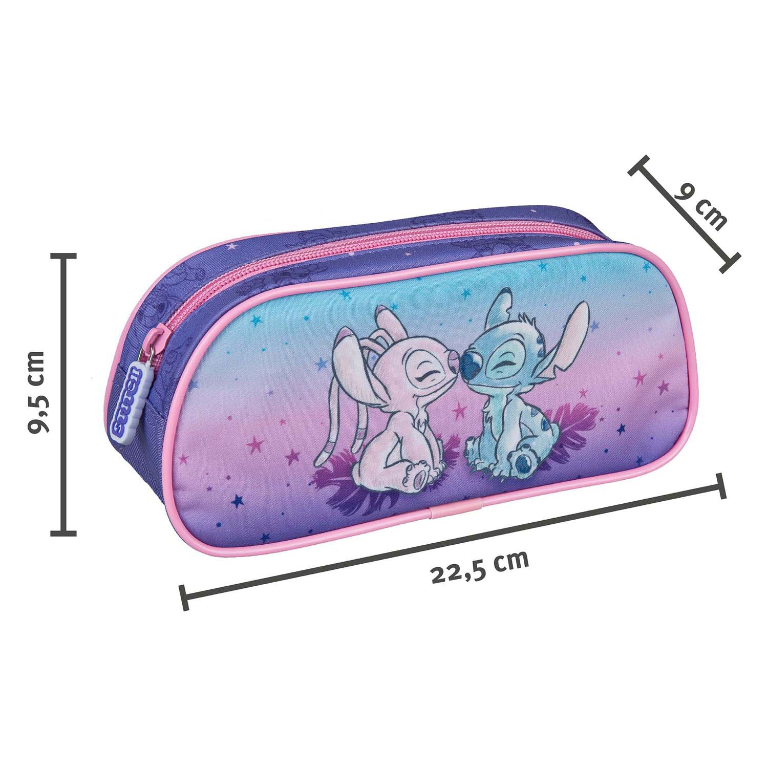 Paars-roze etui met afbeelding van Stitch en Angel. Gemaakt van kunststof, voorzien van dubbele ritssluiting en heeft een formaat van ca. 22,5 x 9 x 9,5 cm.