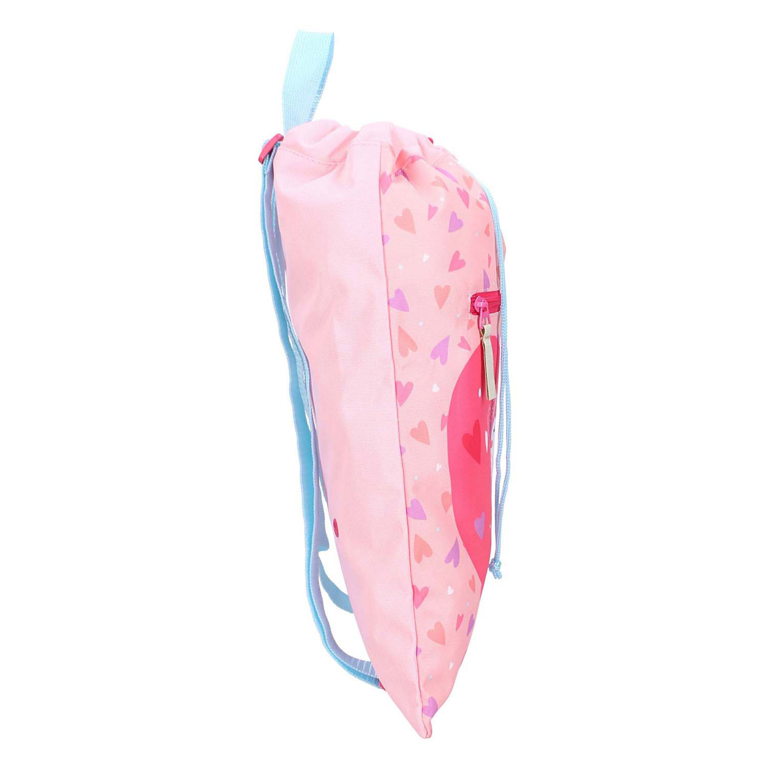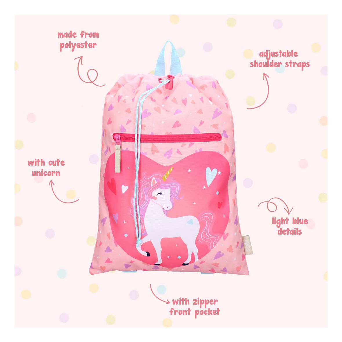 Raak geïnspireerd door deze leuke gymtas van Prêt uit de 'Happy Go Lucky' collectie. Deze roze gymtas is een ideaal item om mee te nemen naar de gym- of zwemles. De roze gymtas is voorzien van een all-over print met hartjes en er staat een prachtige eenhoorn op afgebeeld. De gymtas heeft een treksluiting met touwtjes en verstelbare schouderbanden. Ook heeft de tas een superhandig voorvak met ritssluiting voor kleine spullen, zoals sleutels, elastiekjes of een portemonnee. Met de verstelbare schouderbanden is deze tas voor iedereen op maat te maken. Zo kunnen de kleinste kinderen al genieten van deze leuke gymtas!