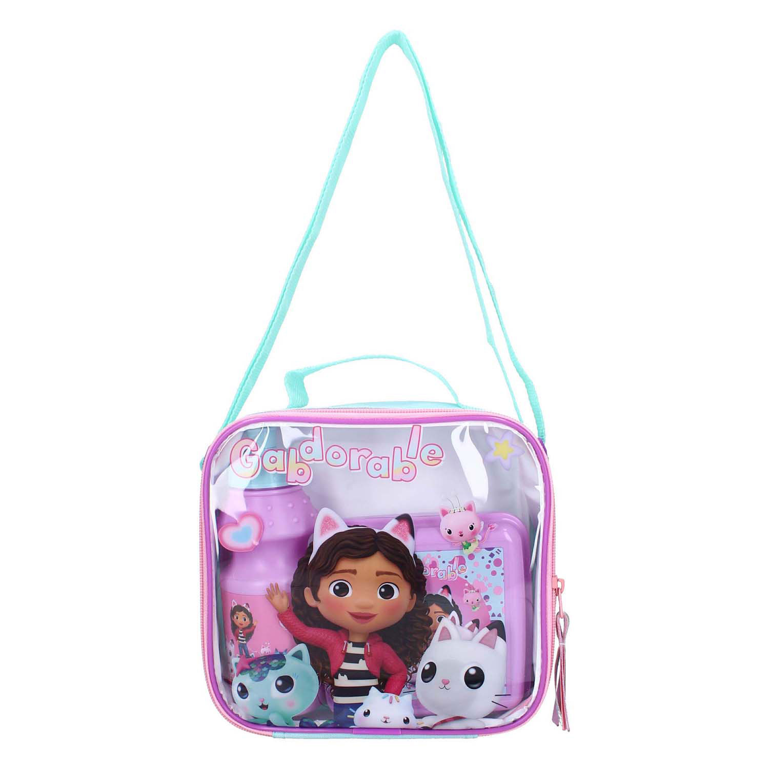 Deze lunchset uit de So Yummy collectie van Gabby's Dollhouse is perfect voor onderweg en combineert stijl met praktisch gemak. De set bestaat uit een paarse lunchtas, een drinkfles met draaidop, en een snackbox met een stevige sluiting. De tas heeft een ritssluiting om alles veilig op te bergen en een verstelbare schouderband voor comfortabel dragen. Dankzij de doorzichtige voorzijde is in één oogopslag te zien wat erin zit, ideaal voor een snelle controle. Met deze vrolijke set wordt lunchen een feestje!