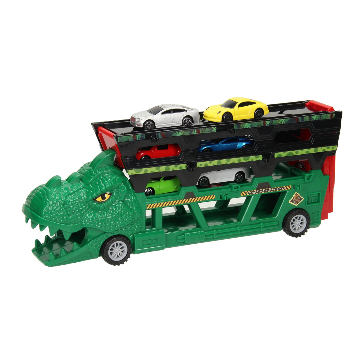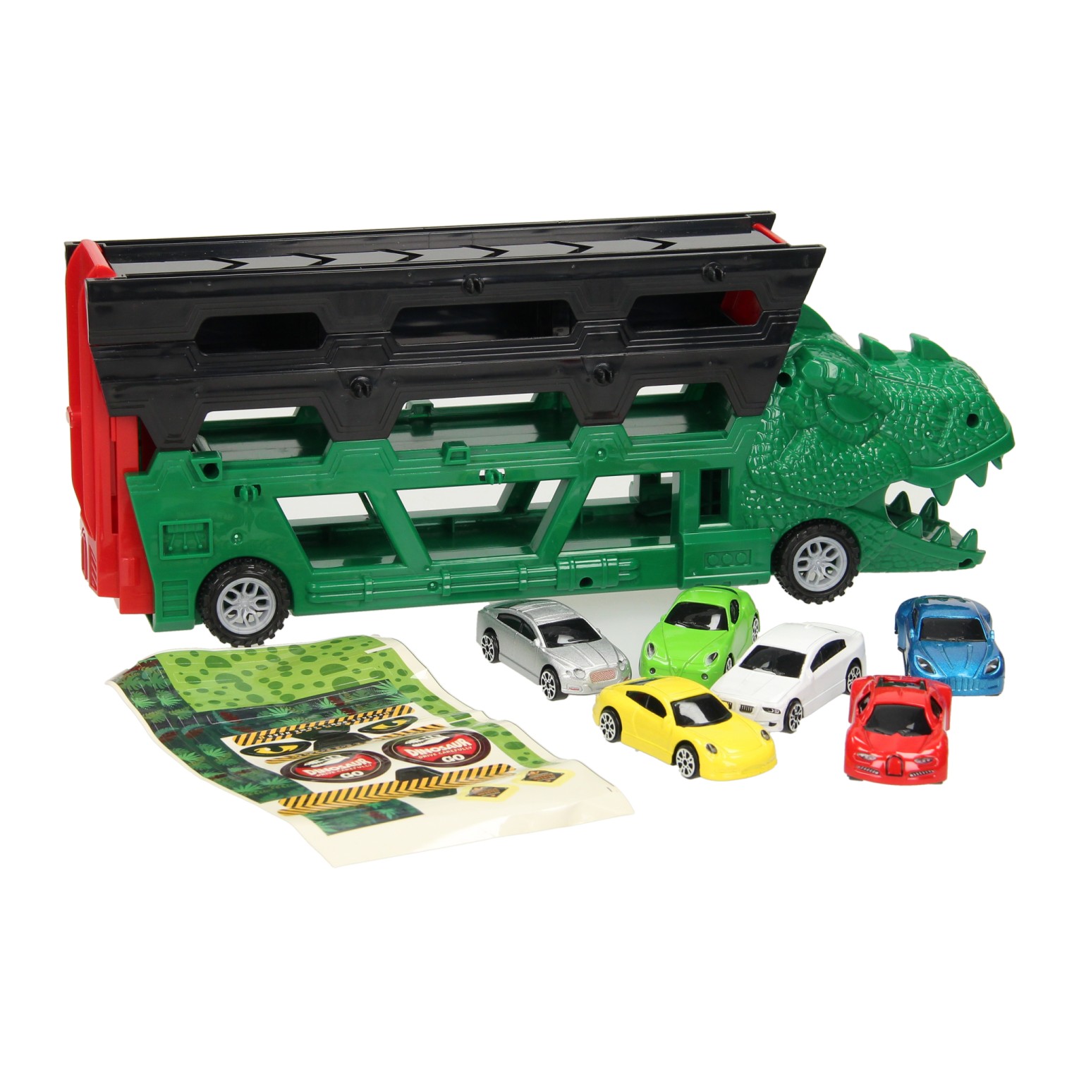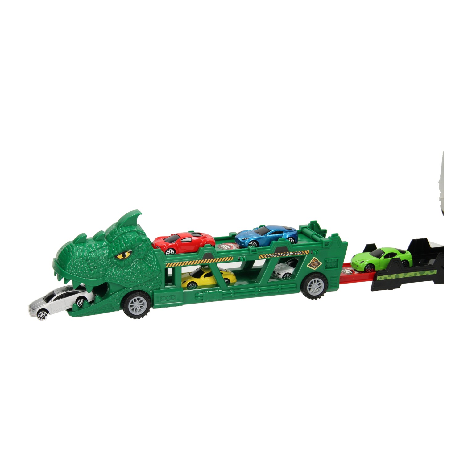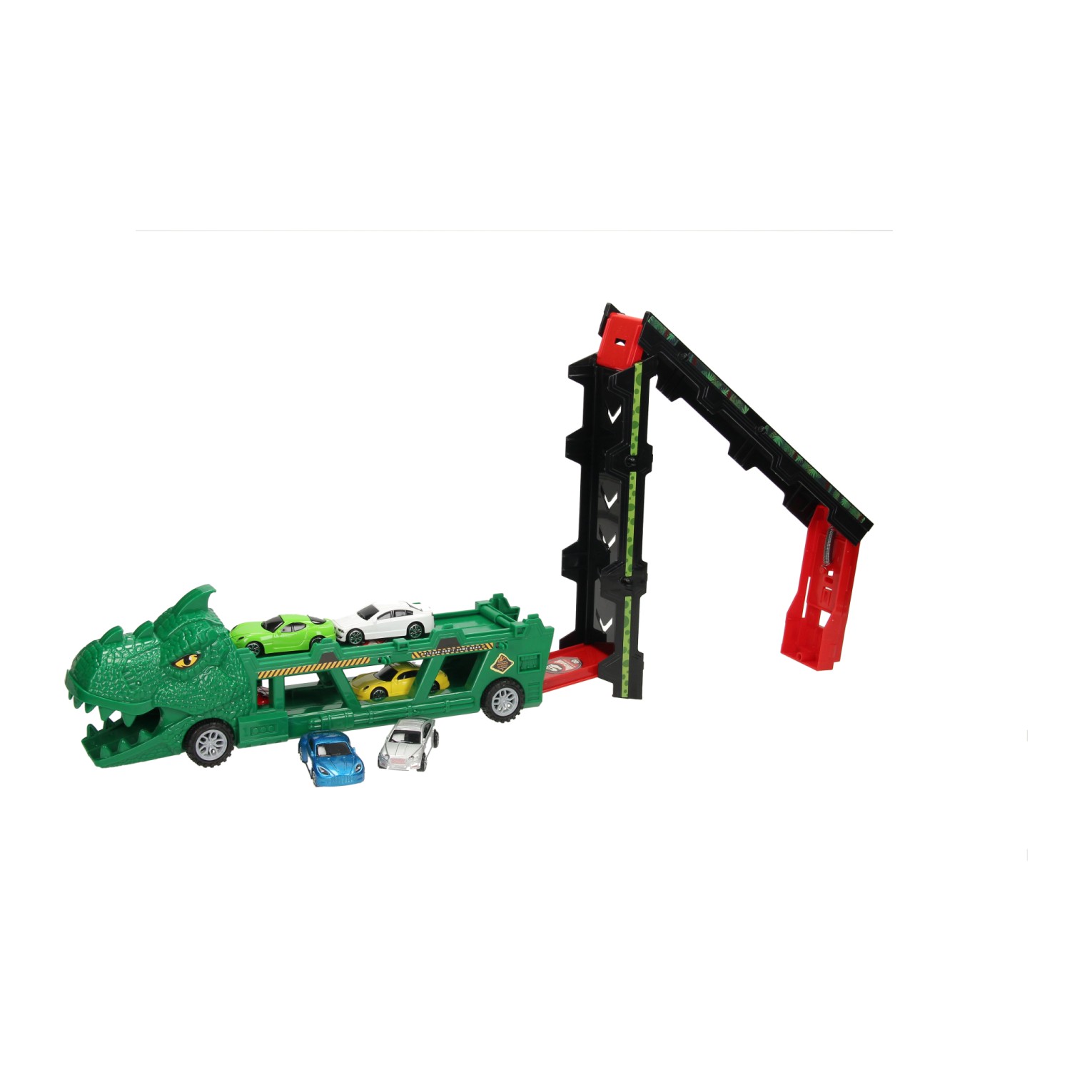 Vrachtwagen in de vorm van een dinosaurus. De vrachtwagen kan 6 kleine auto’s vervoeren, en wanneer de wagen wordt uitgeklapt, verandert deze in een racebaan met afschietsysteem. De set bevat een dinosaurusvrachtwagen en 6 gekleurde autootjes. Geschikt voor kinderen vanaf 3 jaar.