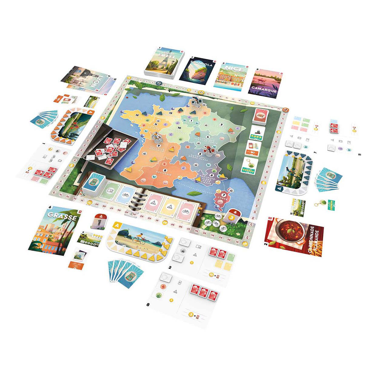 Postcards is een vrolijk bordspel waarin je op je fiets door 13 kleurrijke regio’s racet, op zoek naar de mooiste ansichtkaarten en unieke souvenirs. Zet tactisch je kamp op, plak postzegels, en deel als eerste je avonturen met het thuisfront. Elke ansichtkaart levert je punten en cadeaus op. Door je routes goed te plannen word jij misschien wel de beste reiziger van de regio! Postcards zit boordevol slimme keuzes, vrolijke illustraties en een flink gevoel van avontuur!