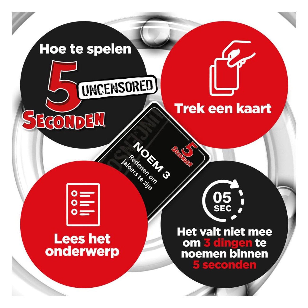 Ben jij snel genoeg om in slechts vijf seconden drie juiste antwoorden te geven? 5 Second Rule 18+ is de ondeugende en hilarische versie van het populaire partyspel, speciaal voor volwassenen! Noem drie dingen binnen een pittige categorie voordat de tijd om is. Klinkt simpel? Wacht maar tot de timer begint te lopen! Dit zenuwslopende spel zorgt voor schaterlachen, gĂȘnante momenten en hilarische antwoorden.