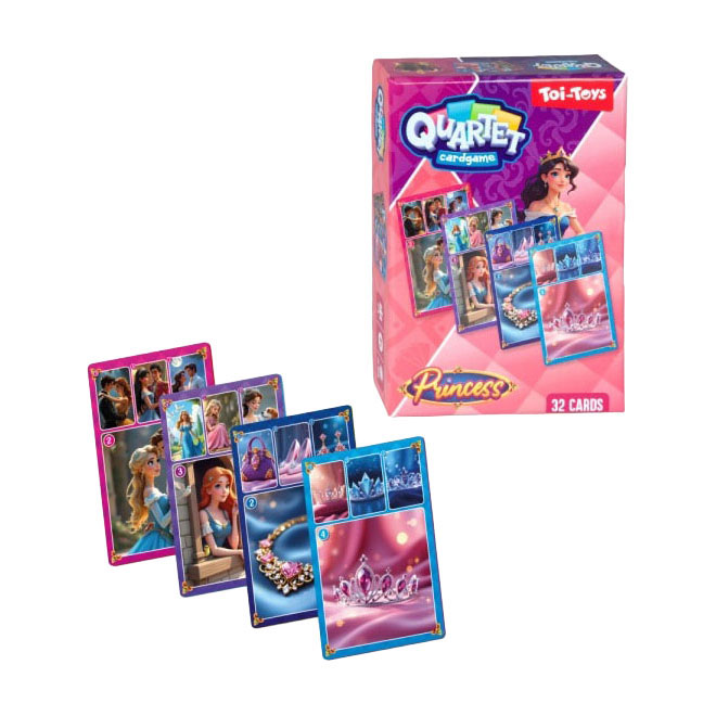 Het Kwartet Princess kaartspel is een klassiek kwartetspel met een prinsessenthema. De set bevat 32 kaarten met kleurrijke illustraties van prinsessen en accessoires. Gemaakt van karton en geschikt voor kinderen vanaf 4 jaar oud.