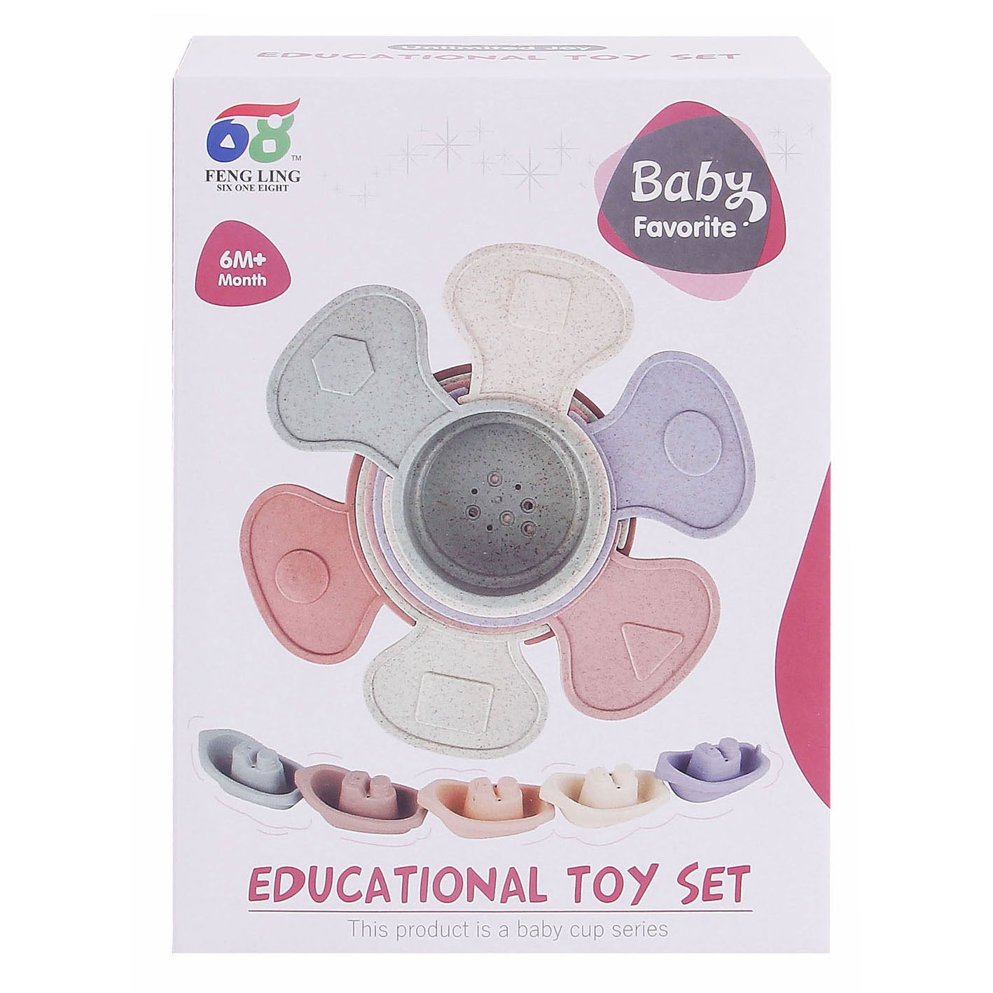 Set badspeelgoed in zachte pastelkleuren. Inhoud: 6 badbekers en 5 badbootjes, gemaakt van stevig kunststof. Geschikt voor kinderen vanaf 6 maanden oud.