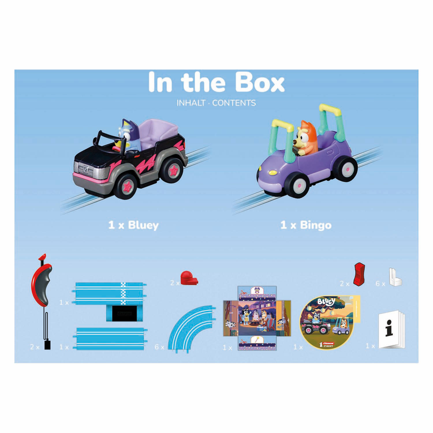 Met de nieuwe Carrera FIRST set "Bluey en Bingo Race" duiken de jongste coureurs meteen in de leuke wereld van de tv-serie Bluey en beleven ze een spannende race tussen Bluey en haar kleine zusje Bingo. Op het 2,4 meter lange circuit sturen de kleine coureurs de twee voertuigen snel over de kleurrijke blauwe banen en scheuren ze door krappe bochten en spannende passages - net als in de serie, wanneer Bluey en Bingo het tegen elkaar opnemen in fantasierijke spelletjes. Een leuke tol zorgt voor extra speelplezier en maakt van elke race een spannende ervaring. De gedetailleerde decoratieve elementen uit de serie creƫren een authentieke sfeer waardoor kinderen midden in de actie zitten. De set werkt op batterijen en biedt uren speelplezier - klaar voor eindeloze avonturen met de Heeler-familie!