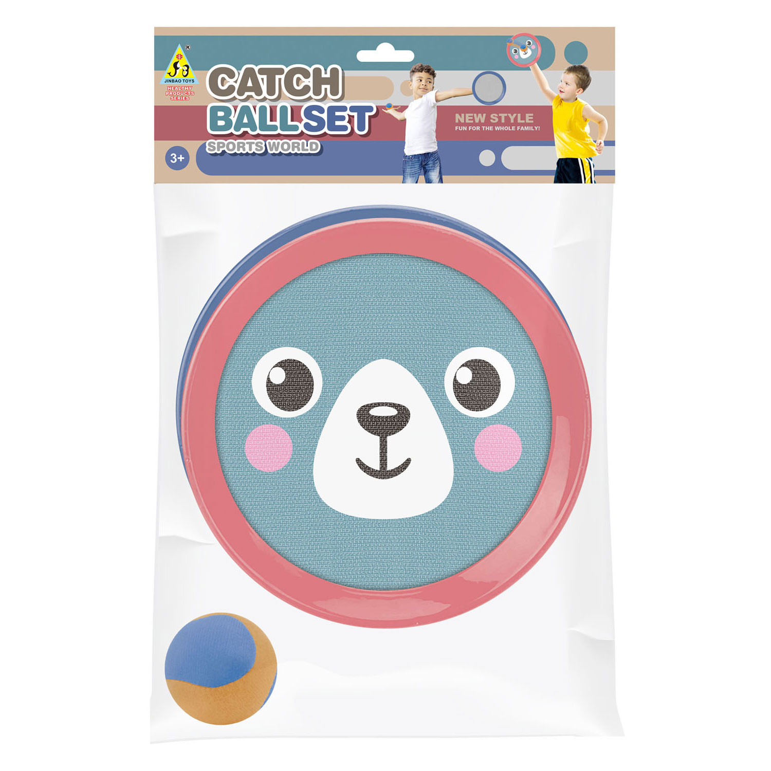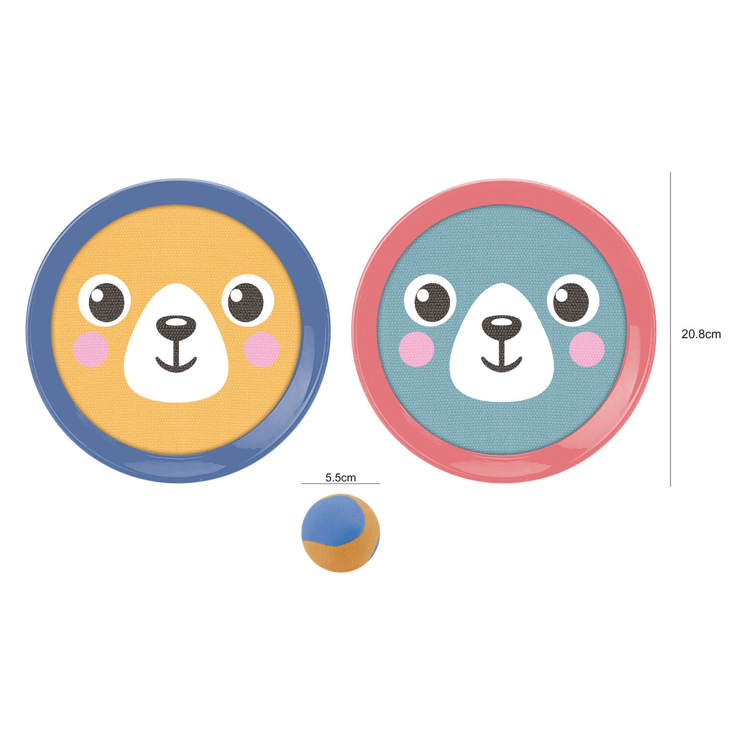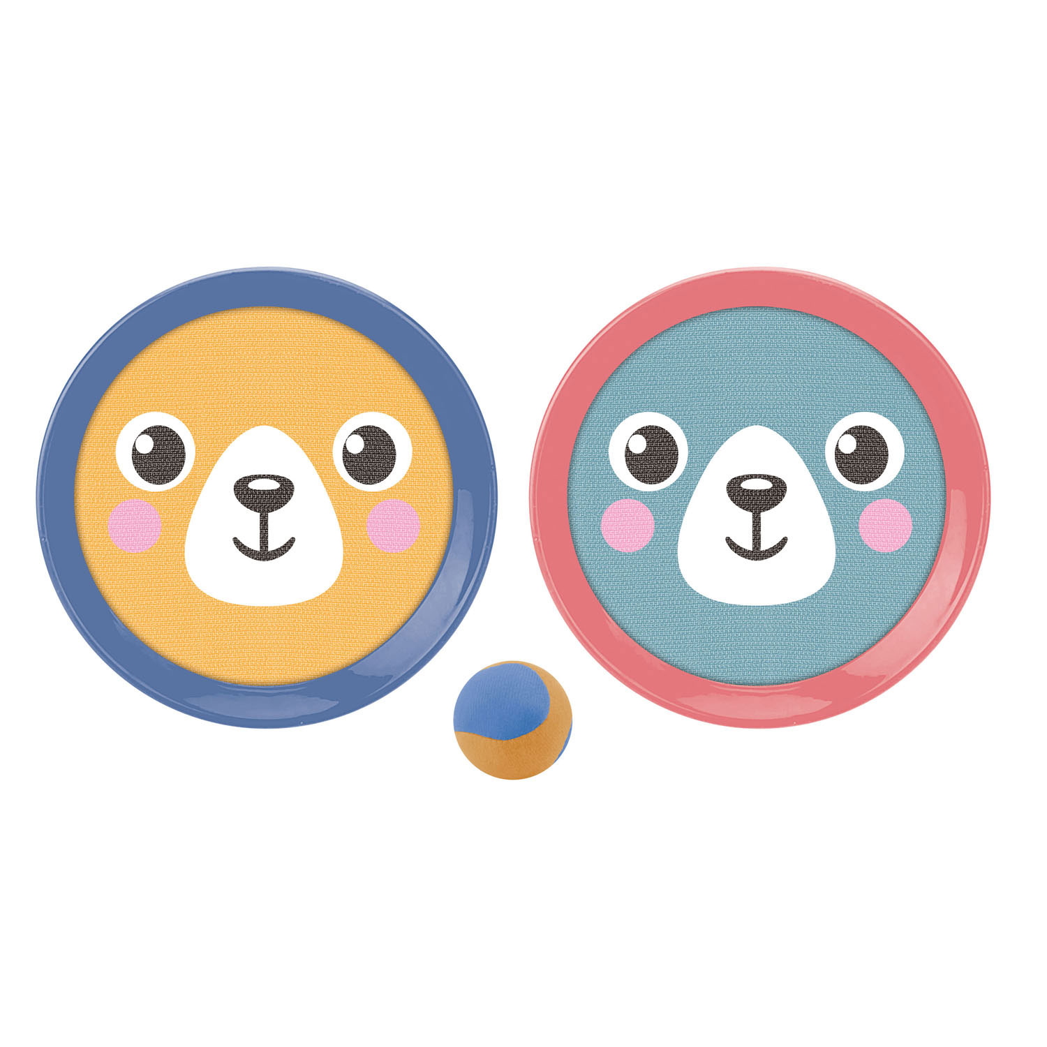 Vang- werpspel met klittenbandschijven en een stoffen balletje, in een vrolijke dierenprint. Geschikt vanaf 3 jaar.