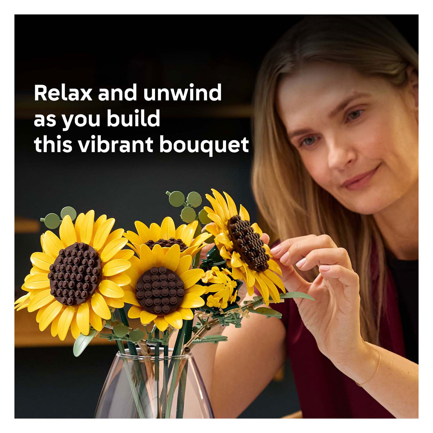 Laat je creativiteit opbloeien met de LEGO® Botanicals Boeket met zonnebloemen (11502) bouwset voor volwassenen.